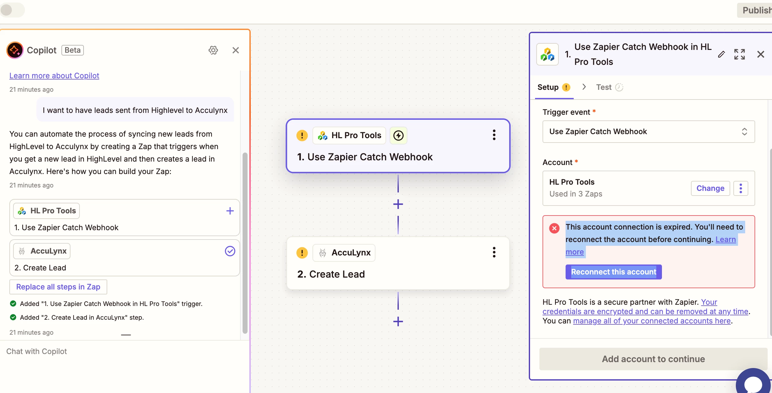 I’m trying to connect my highlevel account to another CRM so leads are created automatically in my CRM. It keeps on telling my connection is expired and I need to reconnect it. I’ve tried reconnecting multiple times, I also renewed my API on my highlevel account and this still did not work. What am I doing wrong?