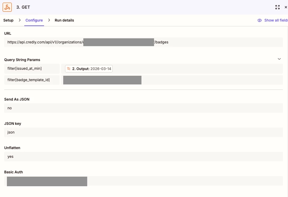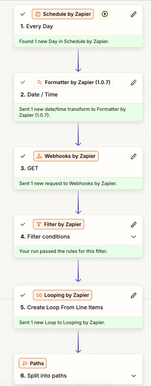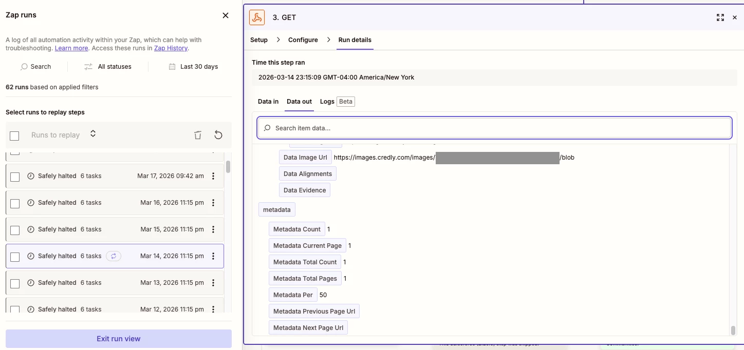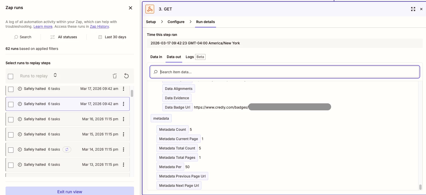 I have a Zap that is scheduled to run daily. It’s purpose is to run an API call with Credly using the Webhooks by Zapier action, filtering on a specific badge, and then to loop the results through a few subsequent steps: getting that badge data into a few of our systems: CRM (Salesforce), Community (Gainsight CC), etc.