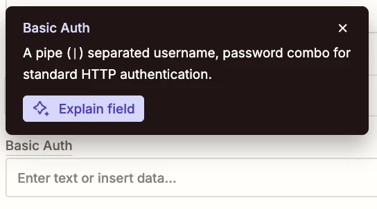I am trying to send data via webhooks and I have configured all the data fields in the Zap. However, I am unable to configure the basic authentication details. These are the instructions I received: