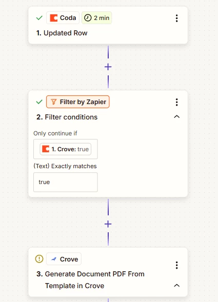 When I click or update a specific column in Coda (e.g., a checkbox called “Crove”), Zapier should trigger and create a draft document in Crove using an existing template, with the variables populated from the Coda row.
