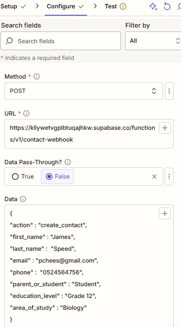 After checking my web app, it seems to be expecting an “action : create_contact”. When the webapp receives the contact detail from the Zap it will create a contact in its own database.