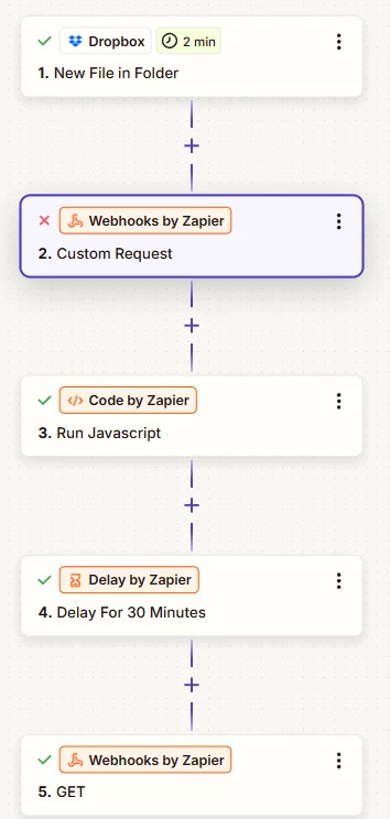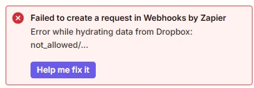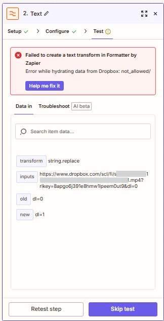 When I did my first run by manually testing/placing the url in the webhook, everything worked perfectly. But when I test the actual automation and taking the new files Dropbox link in to the Javascript, I am hit with the following error: