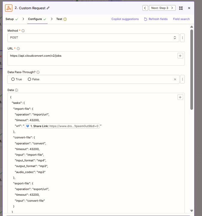 I am trying to create a flow that is triggered when a new file is uploaded to a folder in Dropbox, then take that link, and share it to CloudConvert via webhook, only passing the URL.