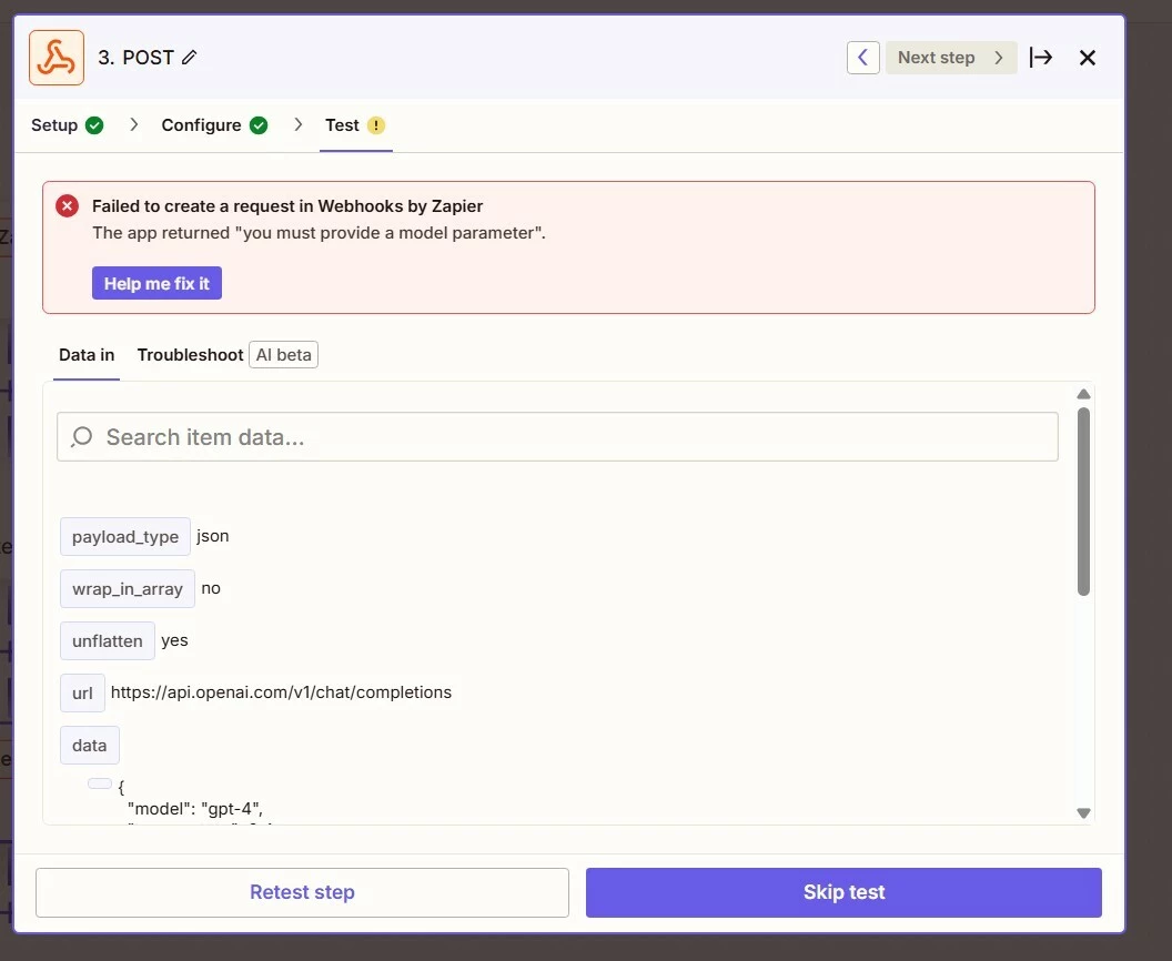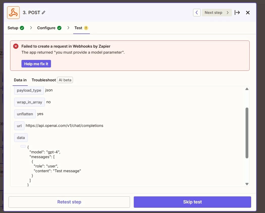 I'm encountering a persistent error when trying to use Zapier's Webhooks/HTTP action to send data to the OpenAI Chat Completions API. Despite including the 'model' parameter in my JSON payload, I consistently receive the error: "You must provide a model parameter." My Zap setup is as follows: