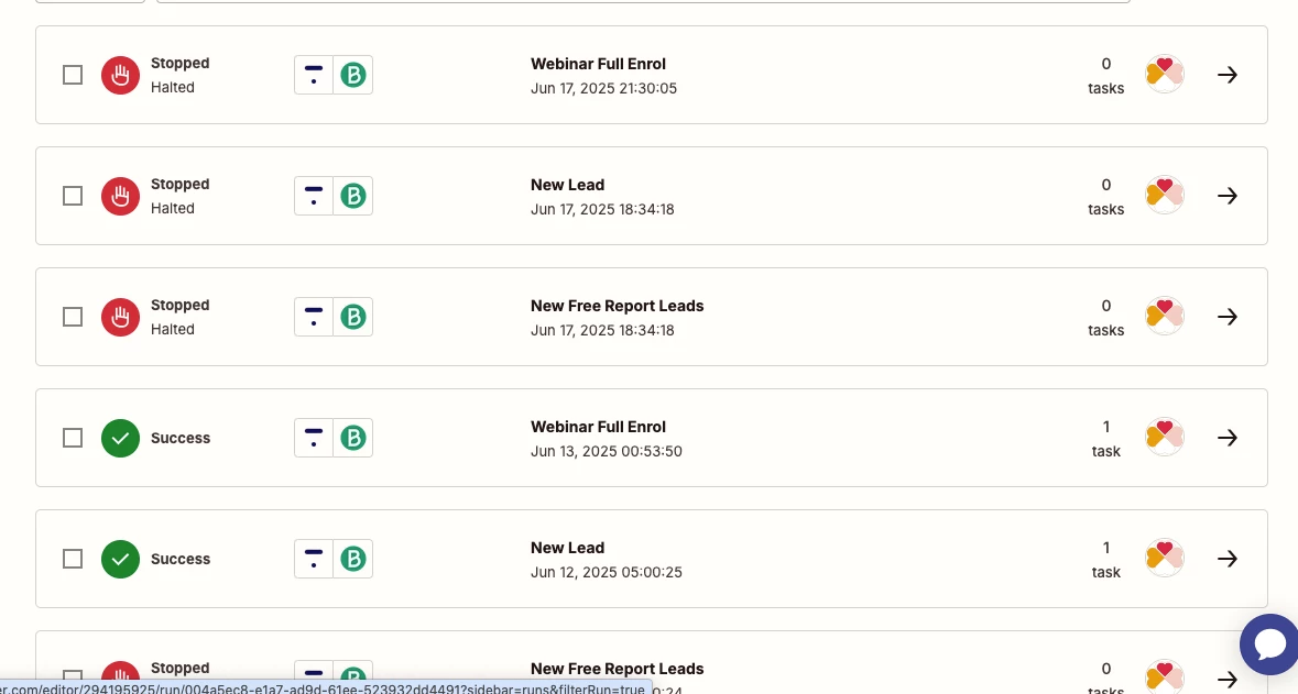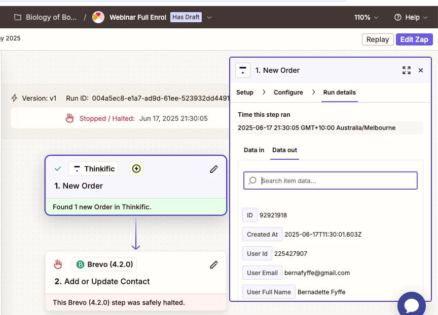 This is a horrible errror. REason is that this zap task was to add Webinar registrant contacts into my mail list which would then get a notification from me for the Zoom Webinar link!!! Of which they didnt get and so didnt get to watch the Live webinar (of which they paid!!)aaaargh. Tragic.
