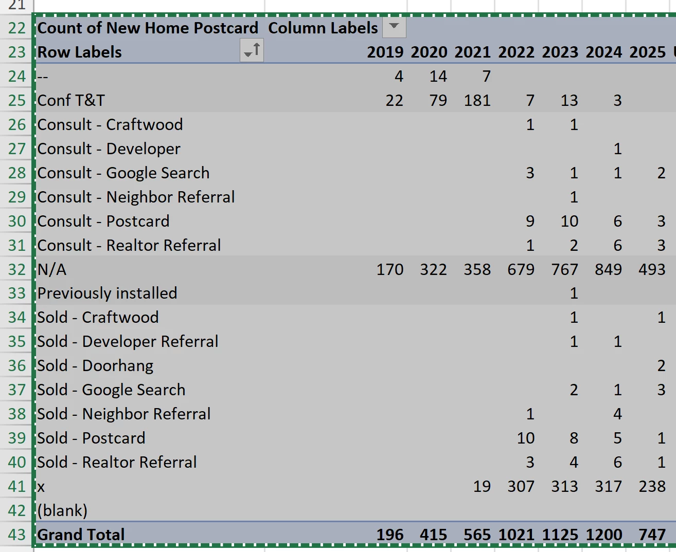 I added a picture below of the Pivot table that we use to pull from the Excel lead tracker to get the raw numbers. And based on these numbers, we do a series of calculations (% to close because of x, % of consults that lead to sales, etc).