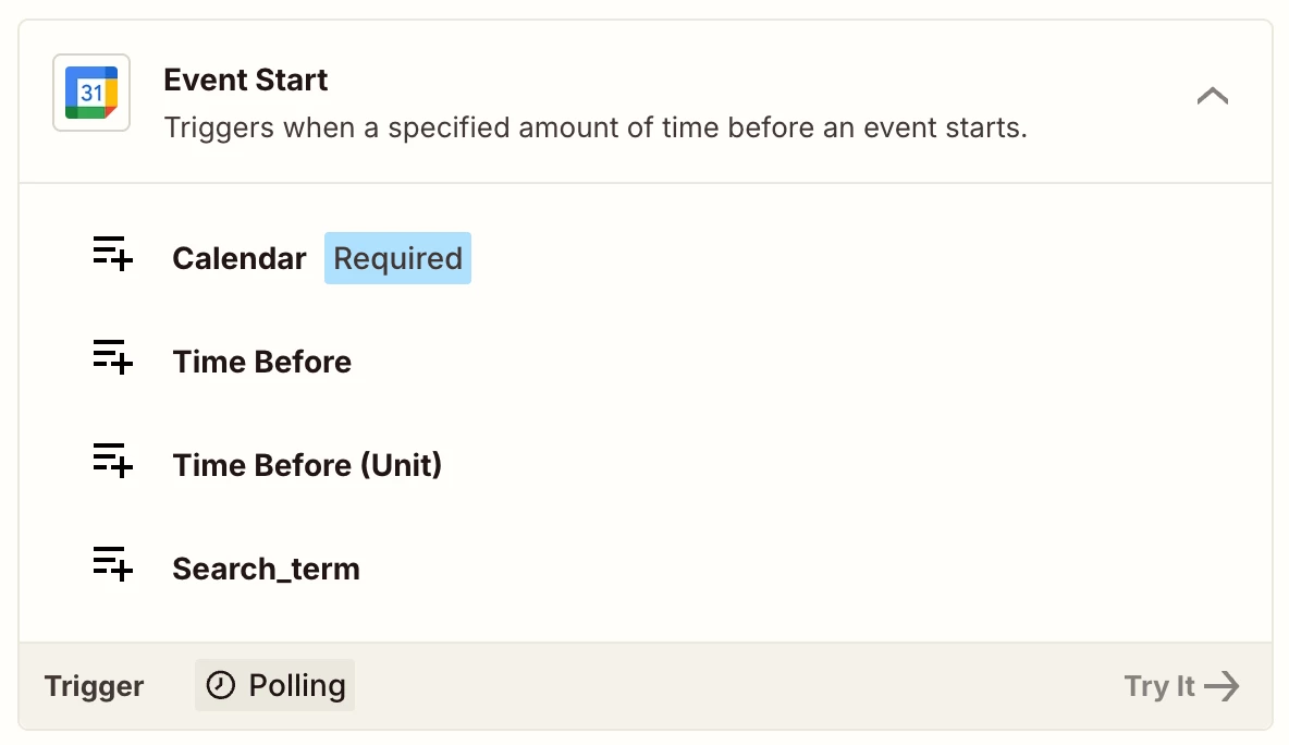 I’ve built a zap that is scheduled to run at 8am every day as that is when I would like to send the same day confirmations for every event. I start with schedule and then added on “Search” for google calendar.
