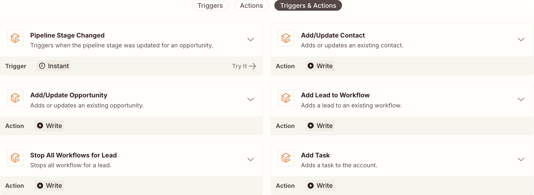 The whitelabeled GHL Zap app integration is called LeadConnector: https://zapier.com/apps/leadconnector/integrations#triggers-and-actions