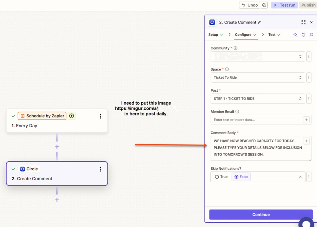 I actually wish to post and 'end of day' notice at midnight every day in the comments box in a post in our group in Circle.so. I am using Zapier to post a text comment at present but I wish to change it to an image-only post. Can you help me do that, please?