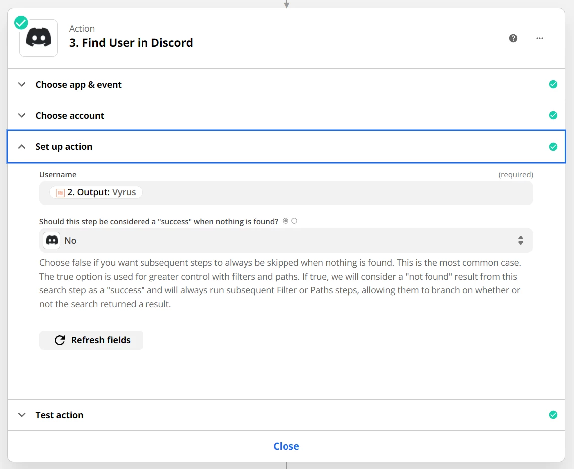 I am trying to set up a Zap that pings the respective user in a Discord Channel after they’ve sent an answer to a google form. The user enters their Discord name and Zap finds them per the “Find User” action. Unfortunately, when using the “Send Channel Message in Discord” action, the User ID input returns “No Data” even though it found the user in the step before. I’ve added screenshots of the Find User and Send Message actions.