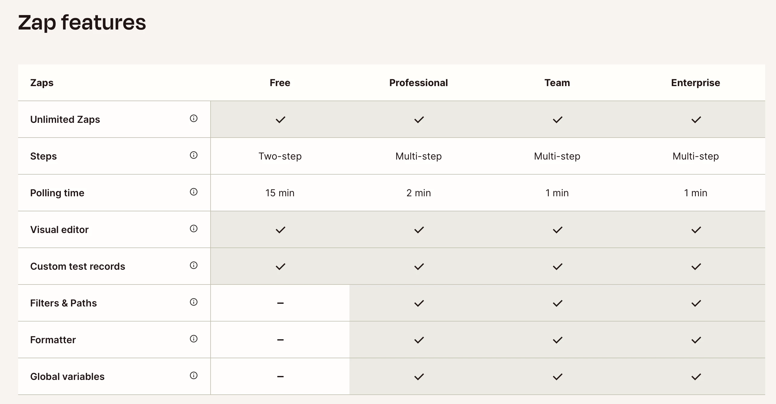 - Required for multi-step Zaps, filters, paths, or premium apps.