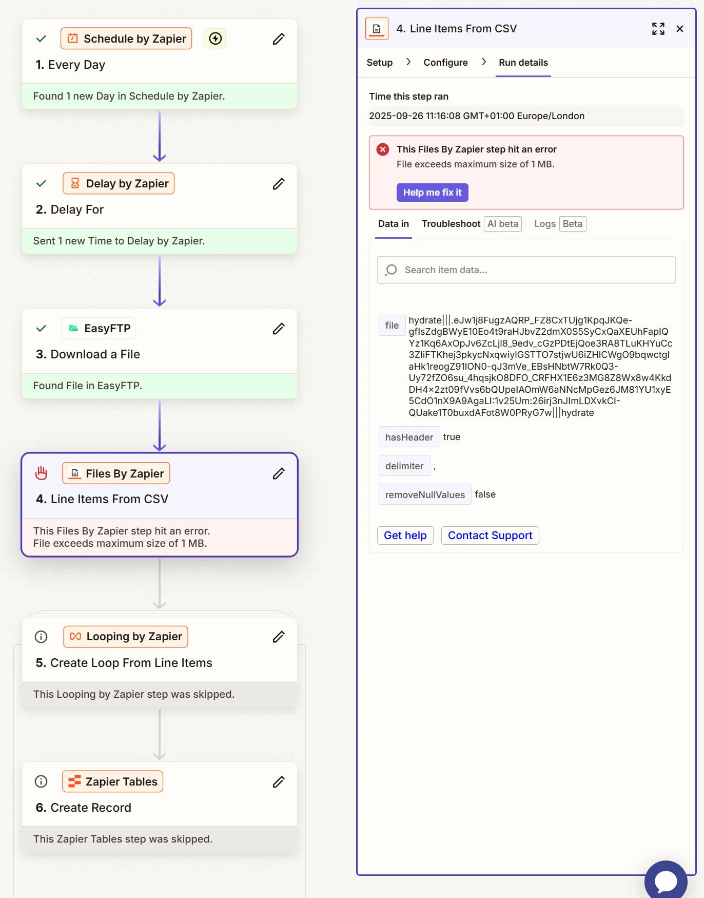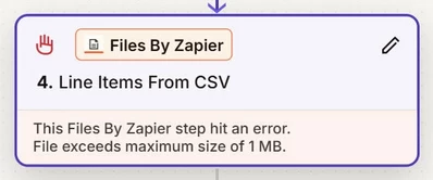 I have a zap which is on a daily schedule to download a CSV file (via Easy FTP) to populate a Zapier table. This was working perfectly until the CSV became larger than 1MB. Now the Files by Zapier step fails…