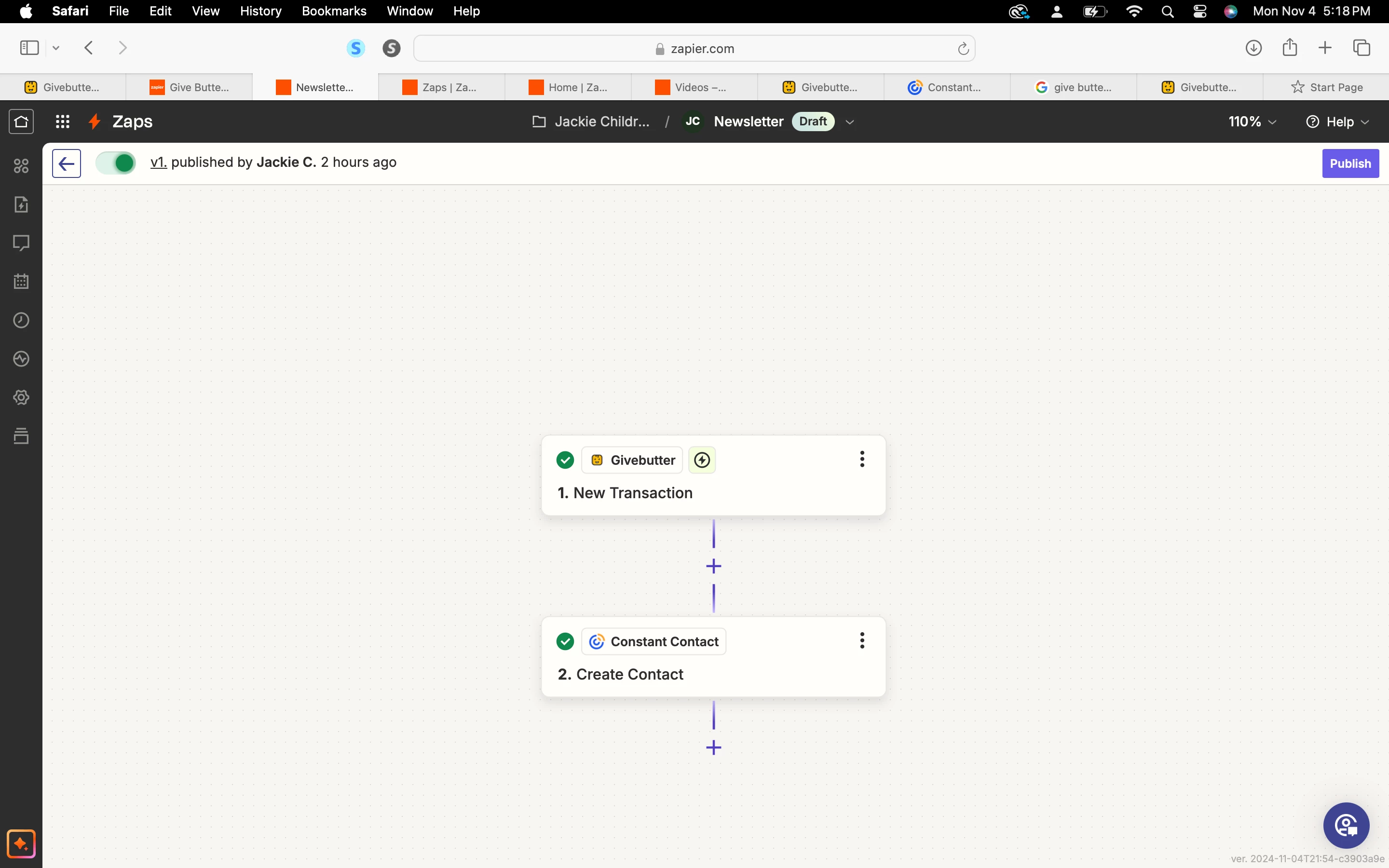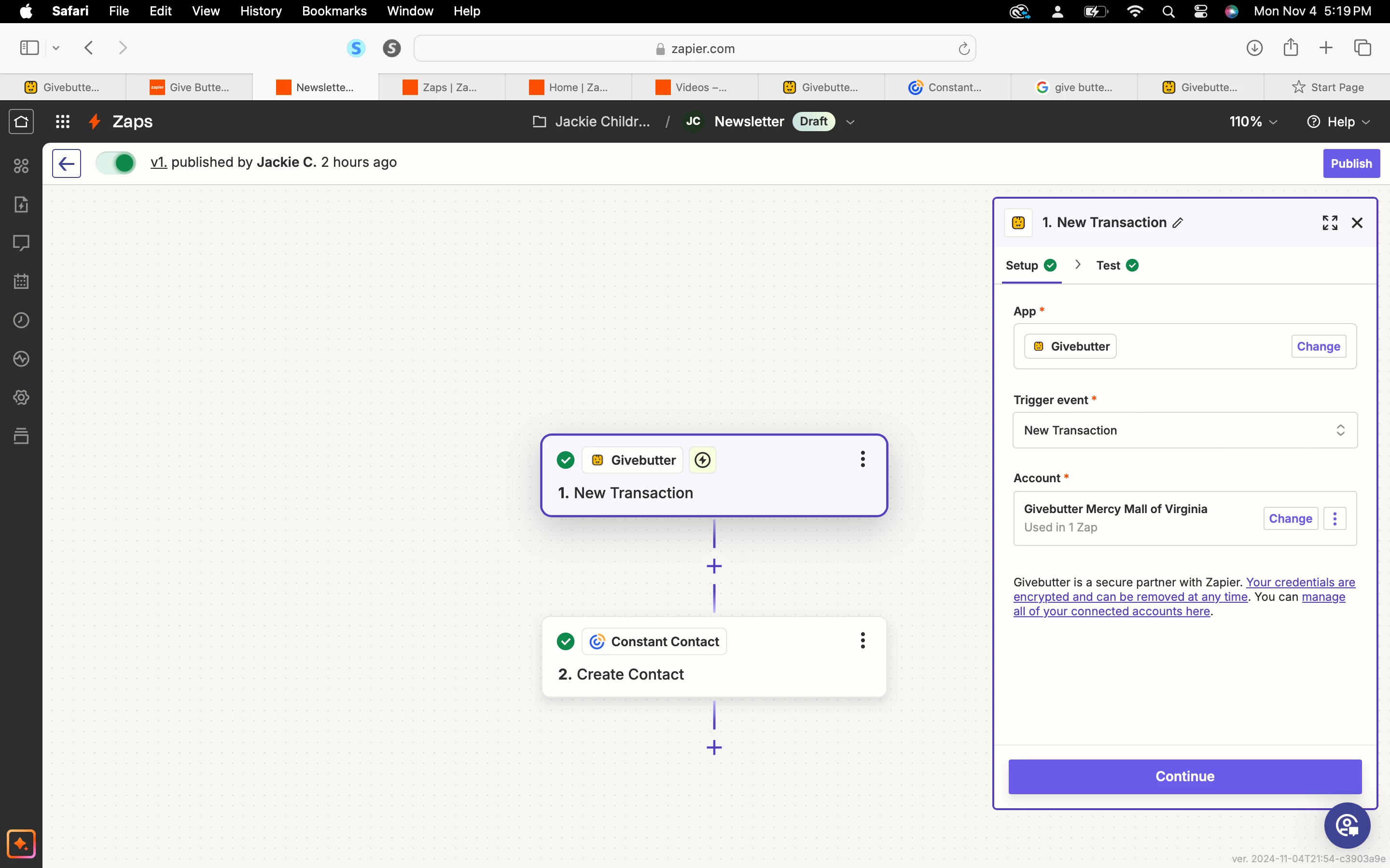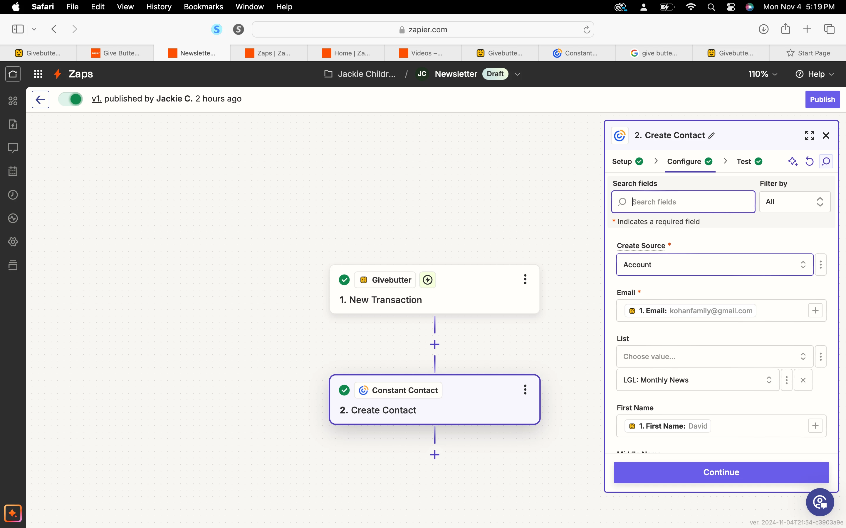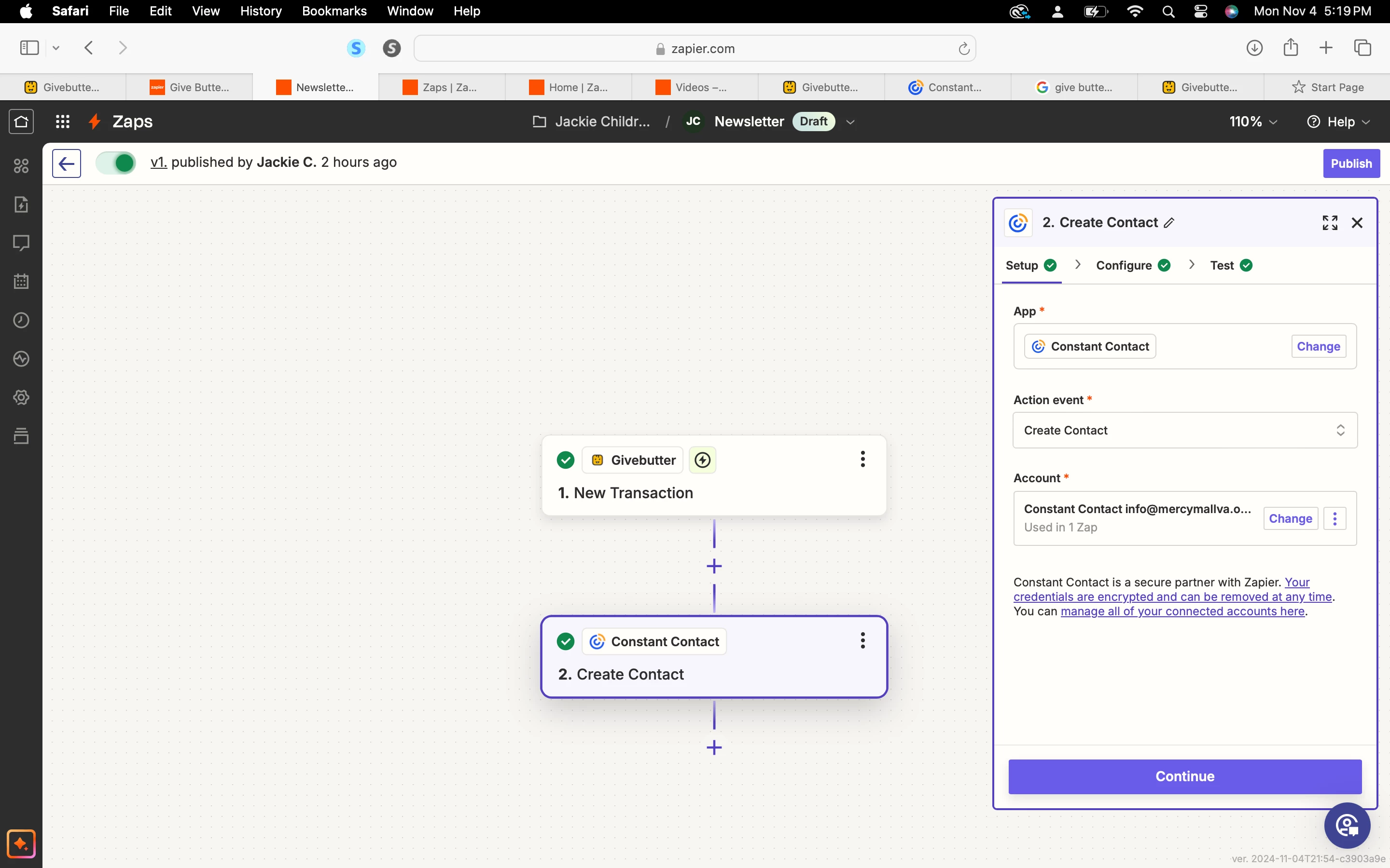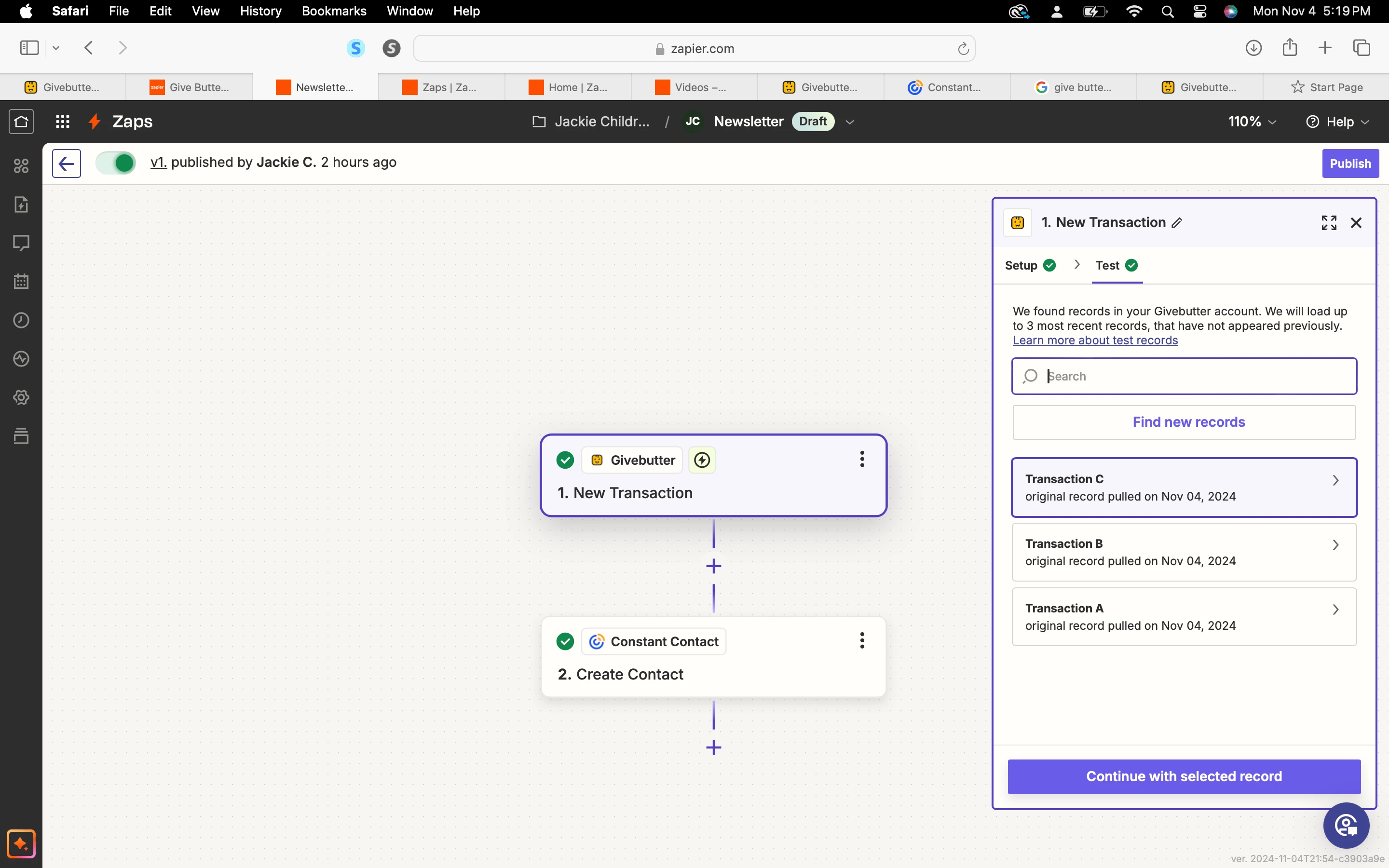I’m trying to zap emails from Give Butter into Contstant Contact. I created a work flow and my ‘test’ went through successfully, but since then, I’ve added other contacts into Give Butter and they have not been pushed through. I do have the Zapier set up to check for new contacts every two minutes.