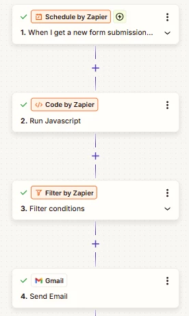 To clarify, the Zap structure has changed slightly during testing, which is why the screenshots showed different step counts. The current structure is: