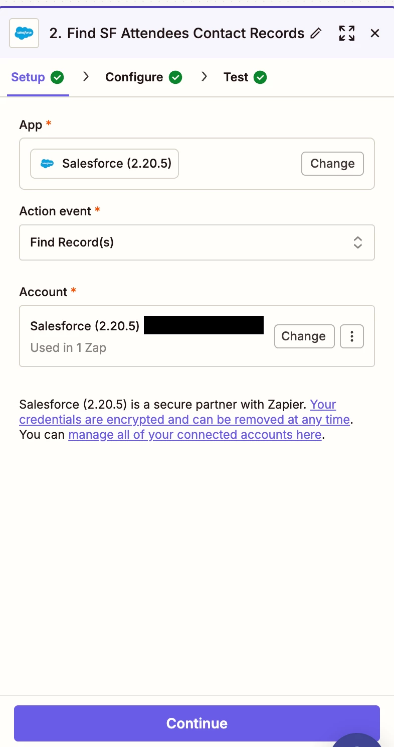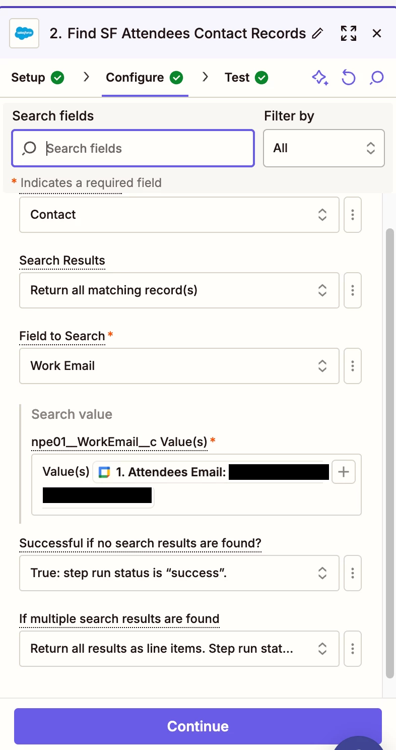 I’m completely new to Zapier, so I’m sorry if this is obvious. I’m trying to create a zap that will create a Salesforce Event when a Google Event is added to a shared calendar. I’d like it to find all attendees’ contact records in Salesforce and add them to this new Salesforce event record.