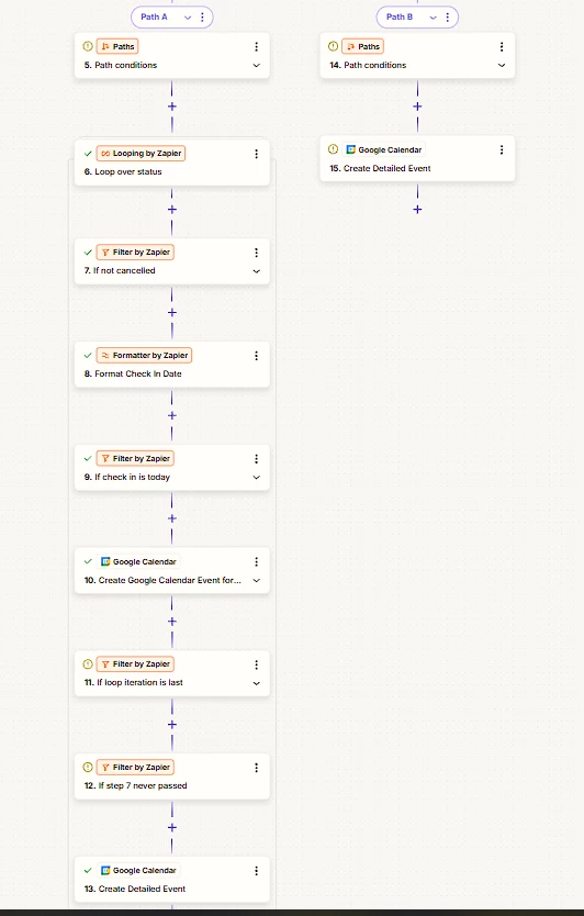 I have an API call which returns a list of bookings. If there are 0 bookings, we use Path B. Otherwise if there is data - I have Path A which uses data received from an API call and loops over that data. I only want to see bookings where the user has not cancelled (and thus needs to be completed) so I have added a filter to check the booking status. For these bookings I add a detailed calendar event.