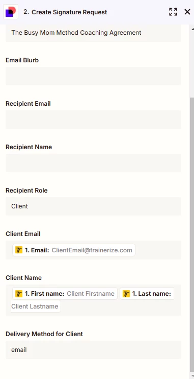 I am trying to Zap my docusign account with a new client added in ABC Trainerize. i have the integratioin set but when i create a new client in ABC Trainerize, the client data does not populate in Docusign. its like its not pulling the right information or any information at all. any help fixing this error would be greatly appreciated! Screenshots attached.