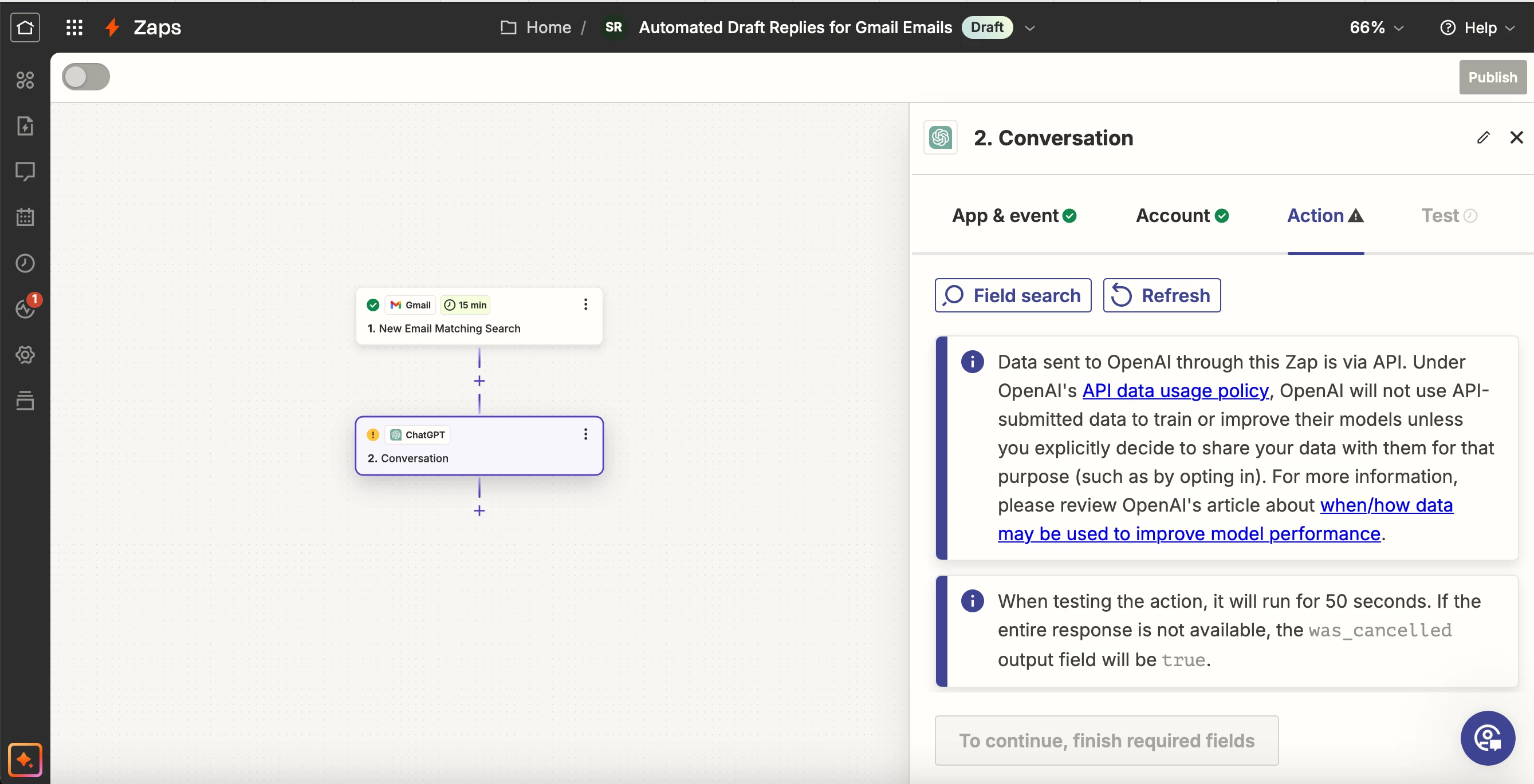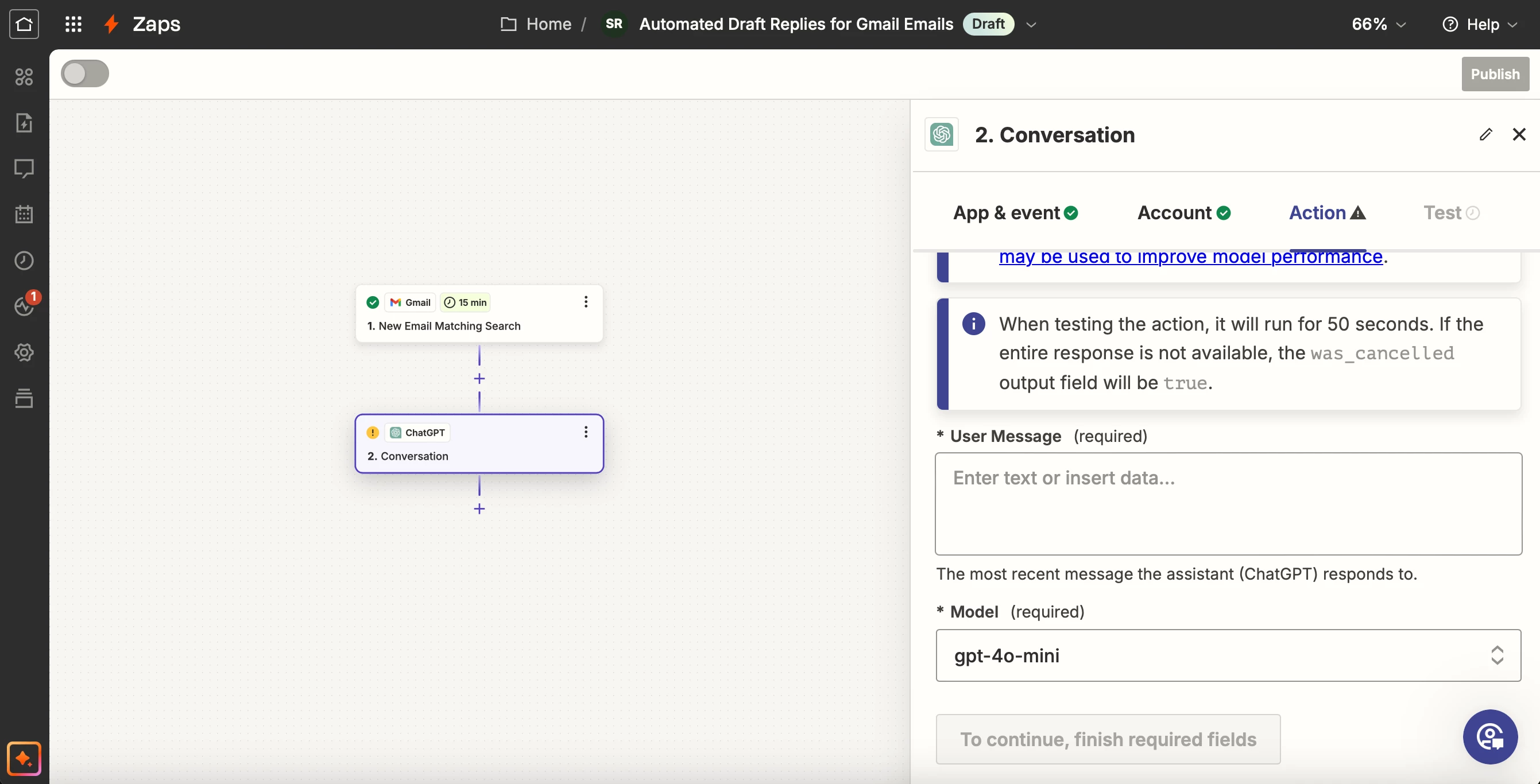 When setting up the zap, I have selected “Conversation” as the action ChatGPT will be doing (as per advice from the bot) and under this, it is asking me to complete a required field called "user message". I have chatted to the bot and it has told me to put the content of the email here, but the content of each email is going to be different.