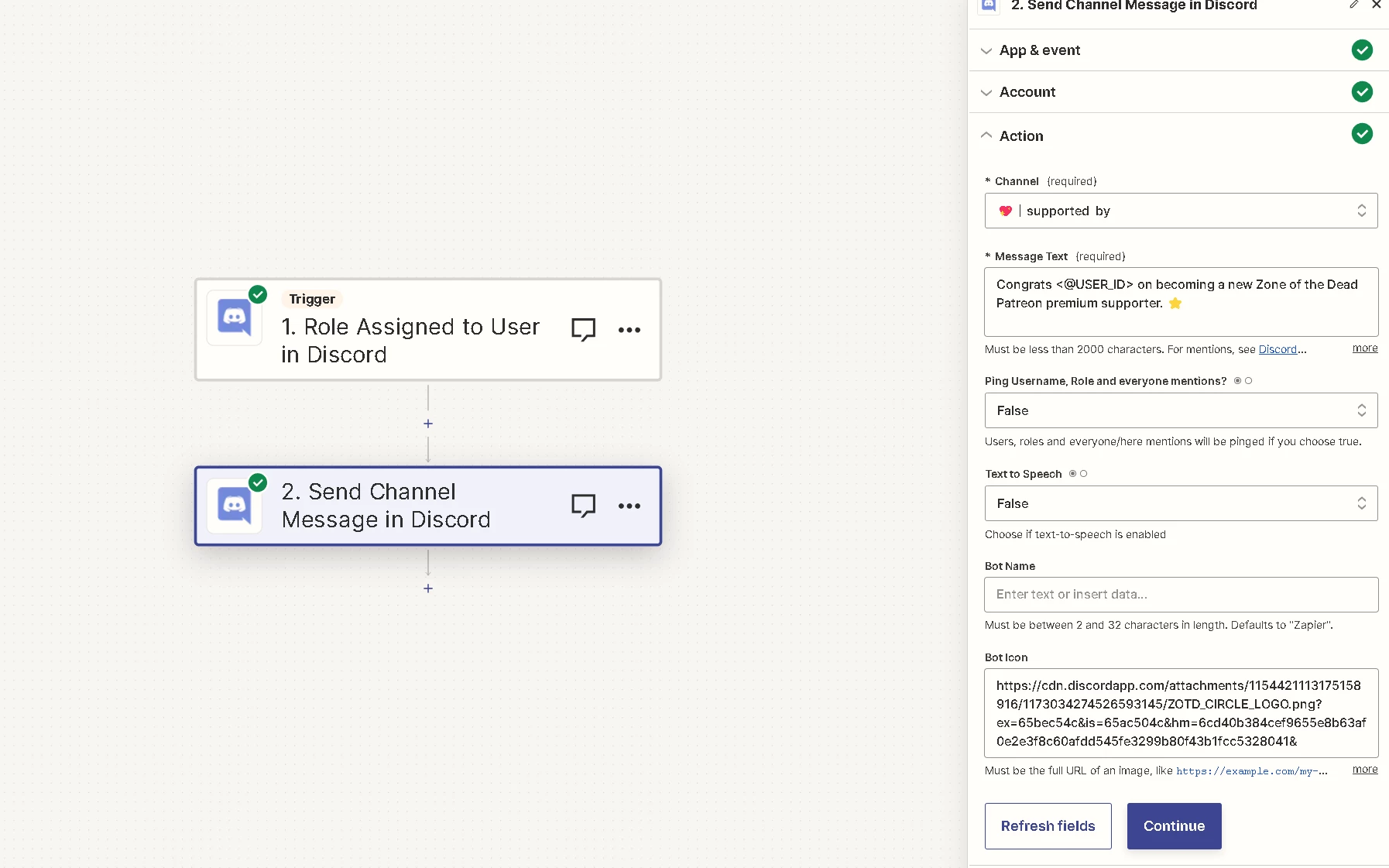 Have you tried mapping the User ID after the “@” symbol as shown in the GIF below. This should dynamically mention a user when they get assigned a role in Discord. If you have tried mapping the User ID, does the bot keep mentioning the same user every time the Zap runs?