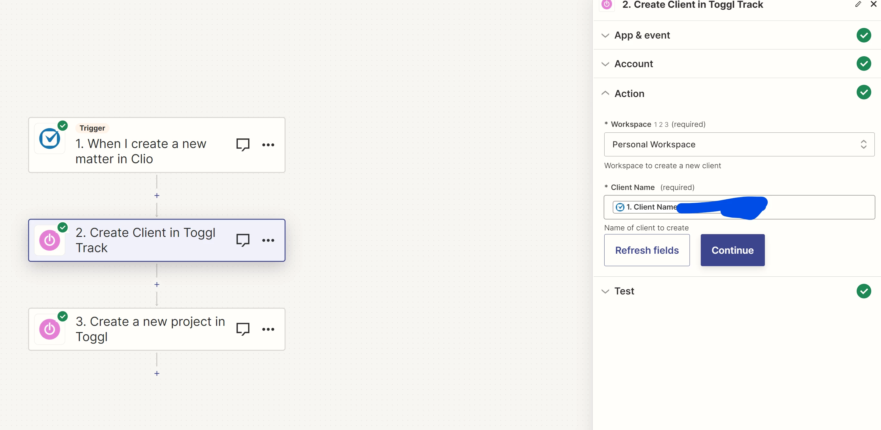 When I create a new matter in Clio, I want Toggl to create a new project. The name of the Toggl project should be the matter number from Clio. I want the client associated with this project to be a new client that has the name of the client from the Clio matter.