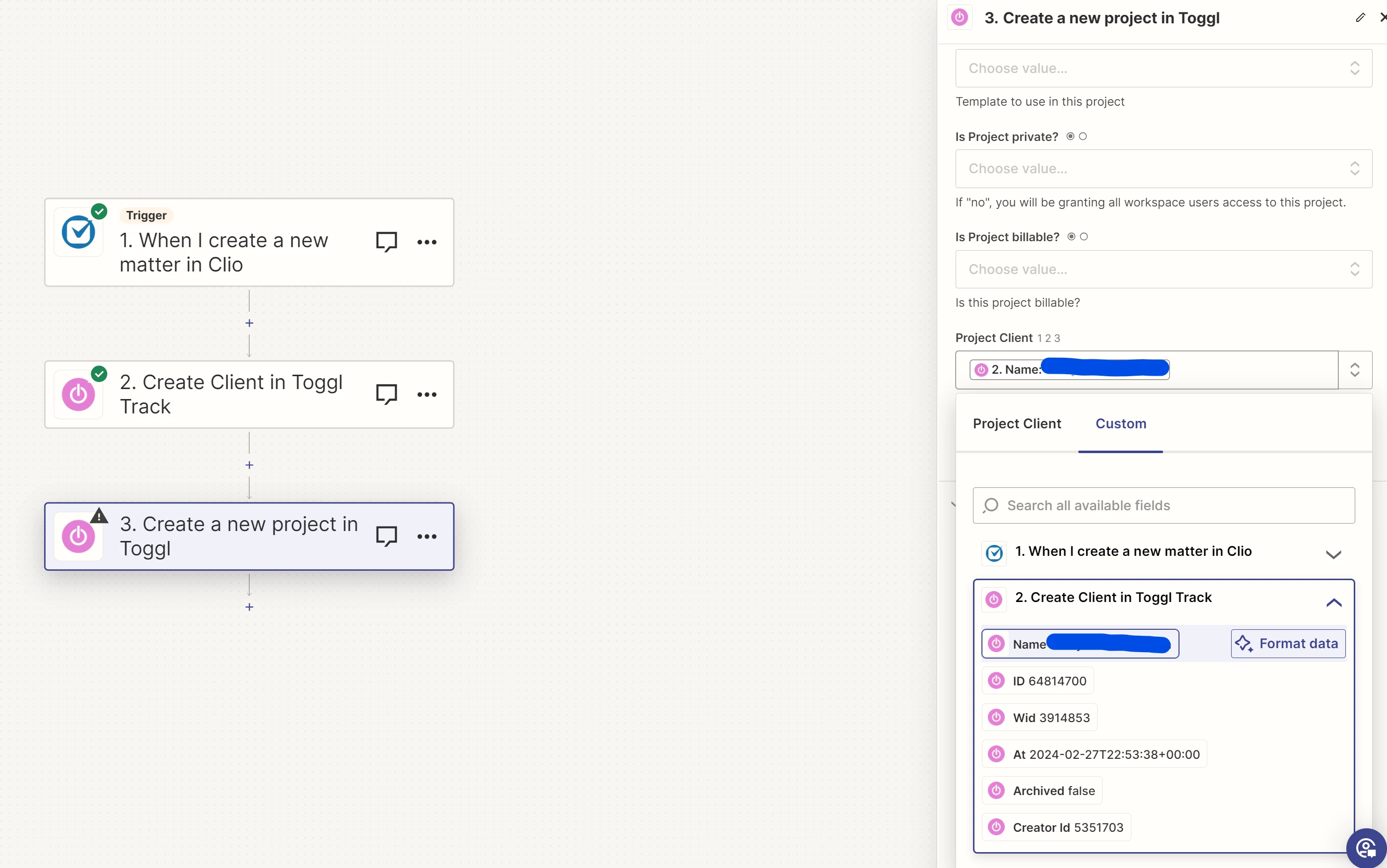 Currently, when I create a new matter in Clio, a new Toggl project is created and a new Toggl client is created, but in the Toggl project the client is still blank. I need the new Toggl client to be attached to the new Toggl project I just created.