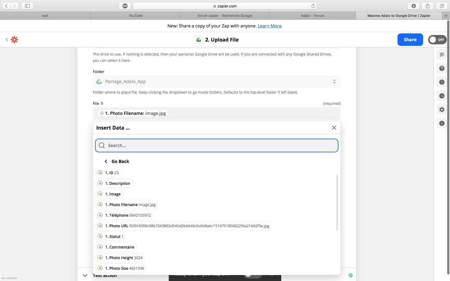 I am trying to transport my photo data from Adalo to my Google Drive. But as you can see on the photo below, the only thing that I can choose is “photo filename” or “photo URL”.