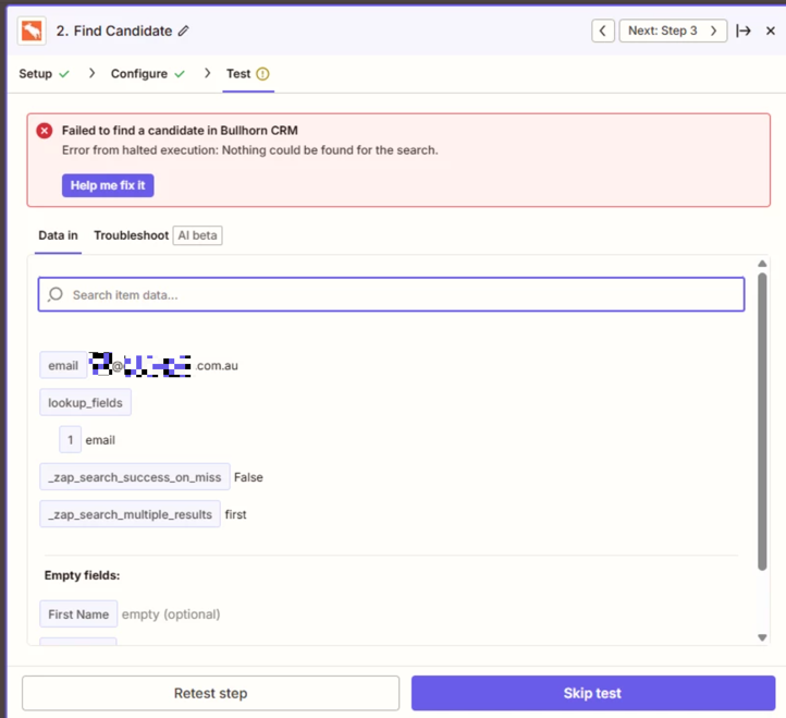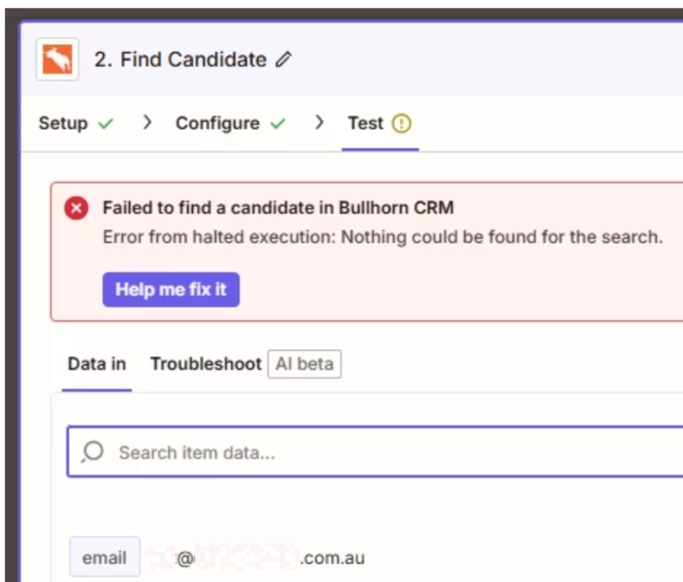 Thank you for all the information.  I have followed your steps and used AI but I am still having issues as shown in the Screen shot below and was hoping you may be able to help.  I am a complete Novice when it comes to this and just trying to create a solution so that when someone fills out a registration form on our website that it updates the candidate information as much as poossible in Bullhorn.