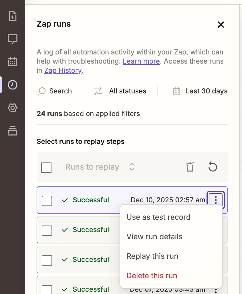- Go to the Zap Run history