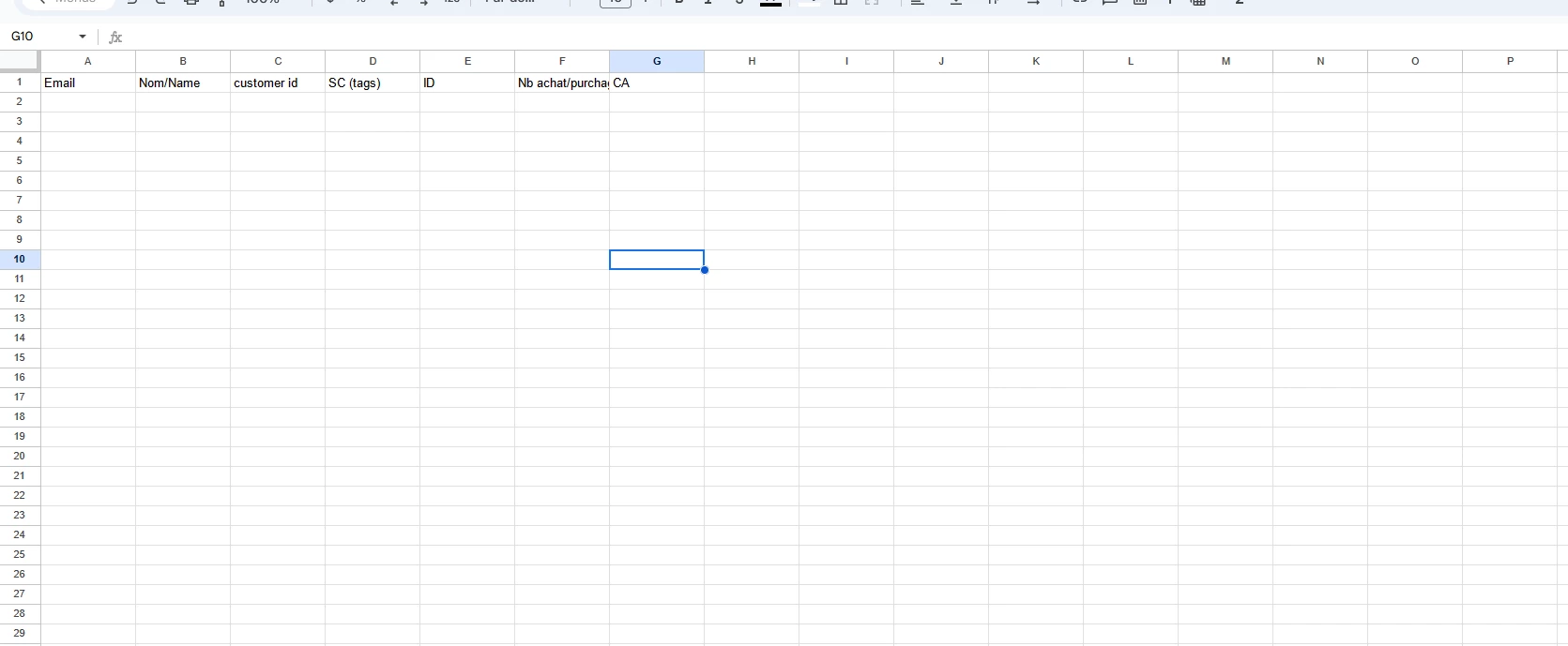 I would like to set up a Google Sheets file with all my customers, including their associated tags and number of purchases, similar to the attached image.