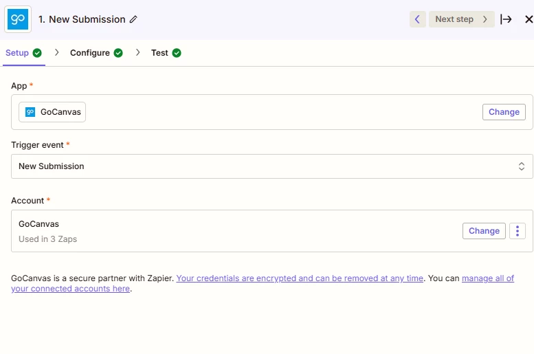 Hi. I’m a very new user of Zapier and need to develop a Zap to transport GoCanvas .csv submission files eventually to my local network for processing. I can connect to gocanvas with no problems but from there I’m kind of stuck on how to attach and process the files. Thanks for any assistance given.
