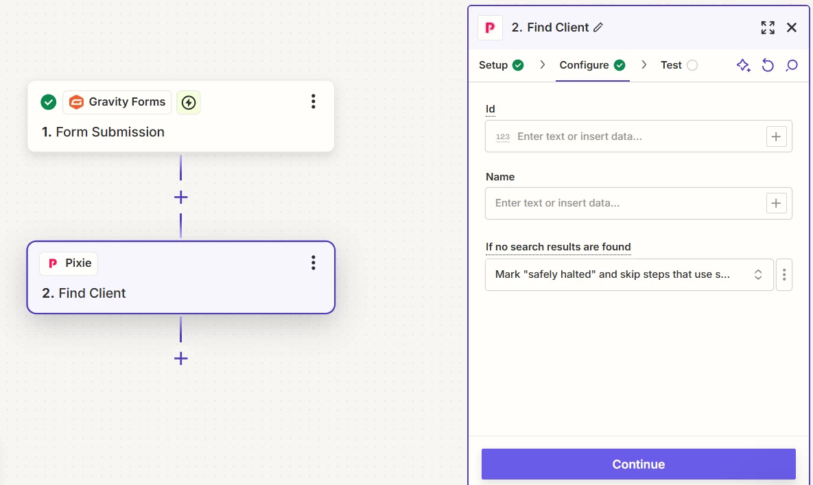 I need to create a Zap so when that Gravity Form is completed (sometimes not all of the questions in the form will be completed so I don’t want blank answers to update fields that already have data in it), the client file is update in Pixie (our practice management software) with all the information provided in the form.