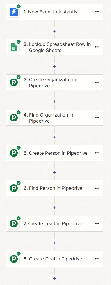 Instantly (Tag) -> Search Find Specific G-Sheet Row -> Create Org: Person: Deal: Lead in Pipedrive.