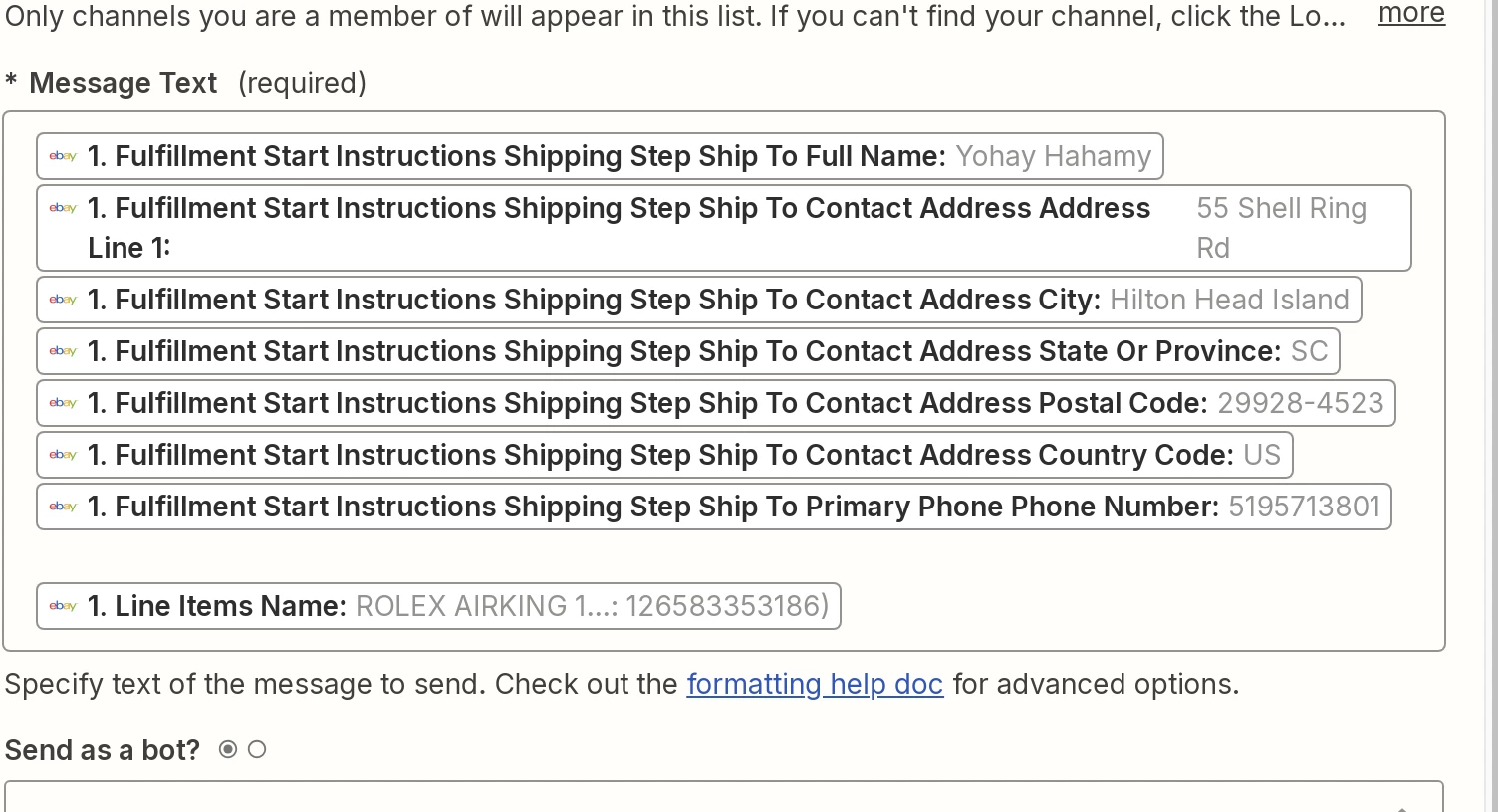 I am setting up a simple Ebay order automation. It is my first time using Zapier and I can’t figure out why the State(SC) phone number and watch type have no breaks and how to fix the formatting. Any help or tips is appreciated