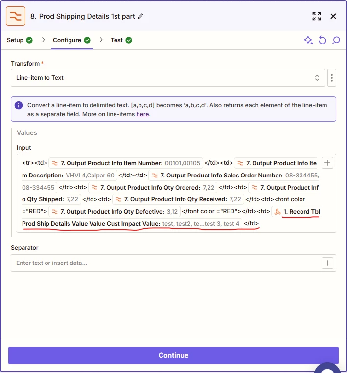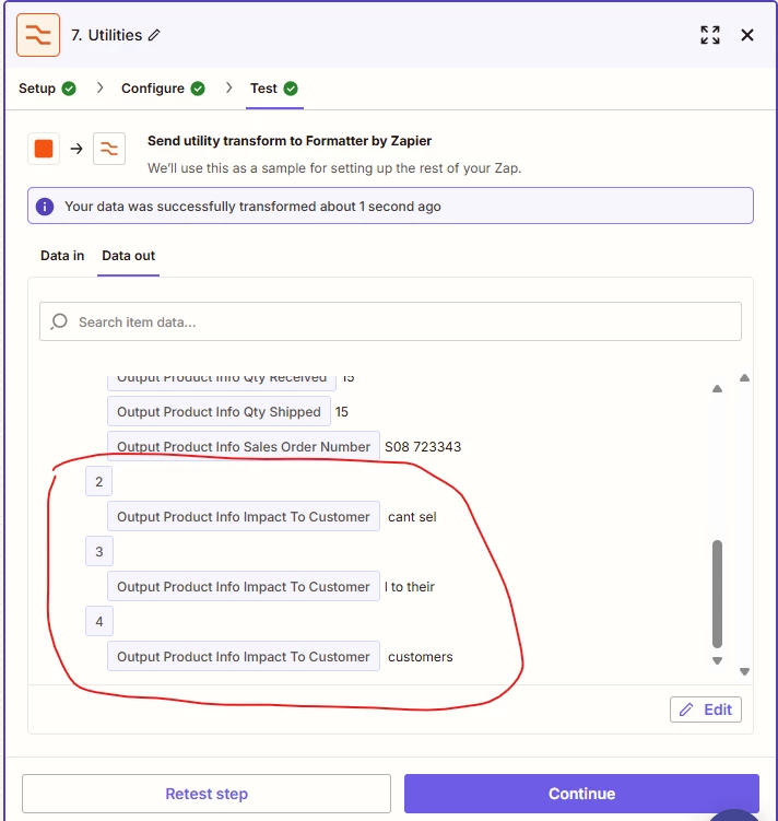 In this example I do not want the Impact Customer sentence test, test1 ,test2, test3 to get split up during formatting. Do I need to do something before this stage to tell zapier not to split the sentence into line items.