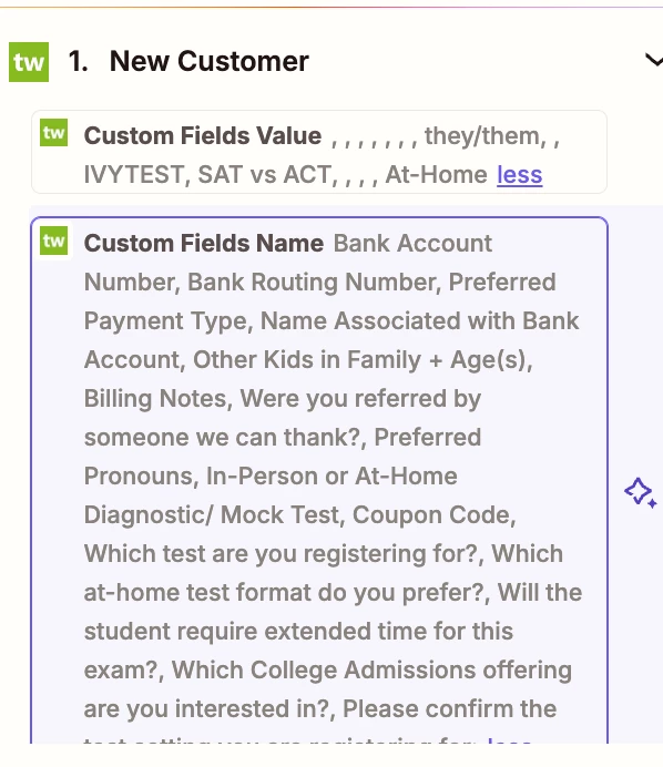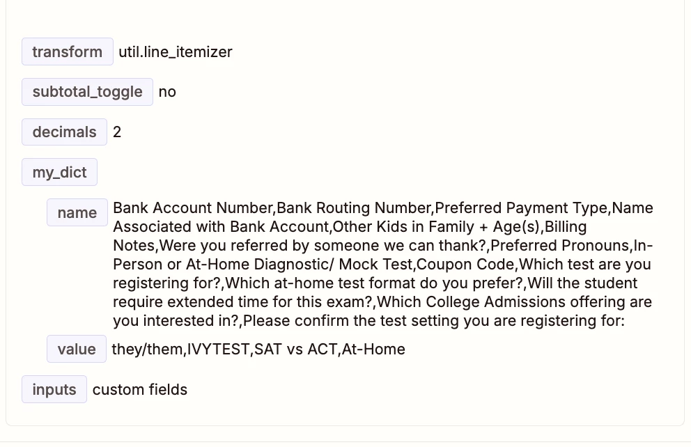 I’m trying to extract the data from just one of those custom fields, Coupon Code. I thought I could just create a Formatter step with Utilities > Line Itemizer, however when I try to do that, all of the empty values and commas in Custom Fields Value are removed. See attached image “input to formatter”. So the Line Itemizer is unable to correctly match up custom field names and values, as it now thinks there are just 5 values in “Custom Fields Values”.