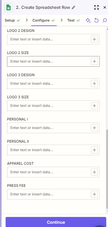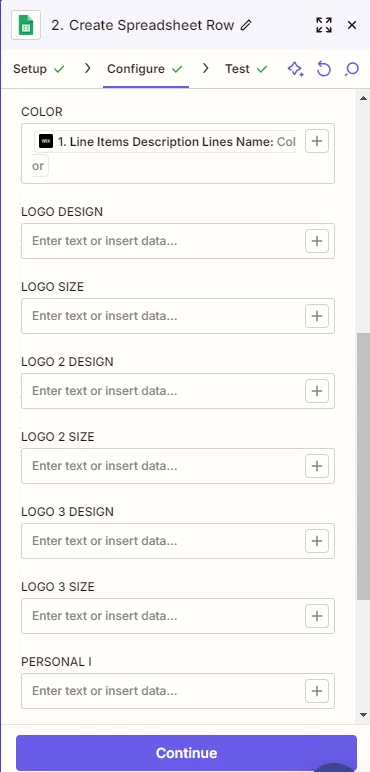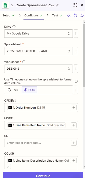 Here is my zap along with the configuration. I have a few things I’d like to achieve. As I mentioned in my first post, I am looking to have the string of letters and numbers at the end of the product name to be placed into the “MODEL” column for the order in spreadsheets. Though I can manage if it has to implement the entire name of the product. Example: Port Authority® Silk Touch™ Performance 1/4-Zip | K584 instead of just K584.