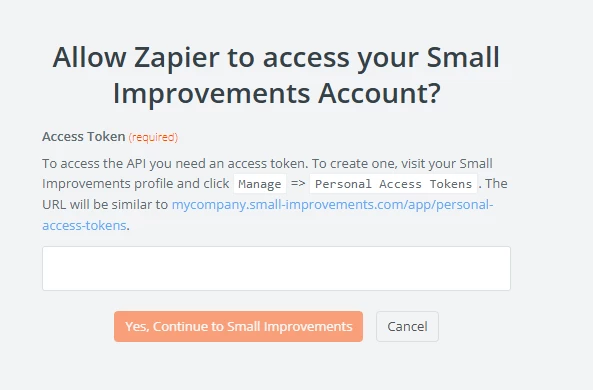 Trying to connect Zapier to Small-Improvements, with the Personal Access Token the connection works fine from outside Zapier tested and gives HTTP/1.1 200 OK when we do: curl -H 'Authorization: Bearer TOKENHERE' https://app.small-improvements.com/api/v2/users/me -I