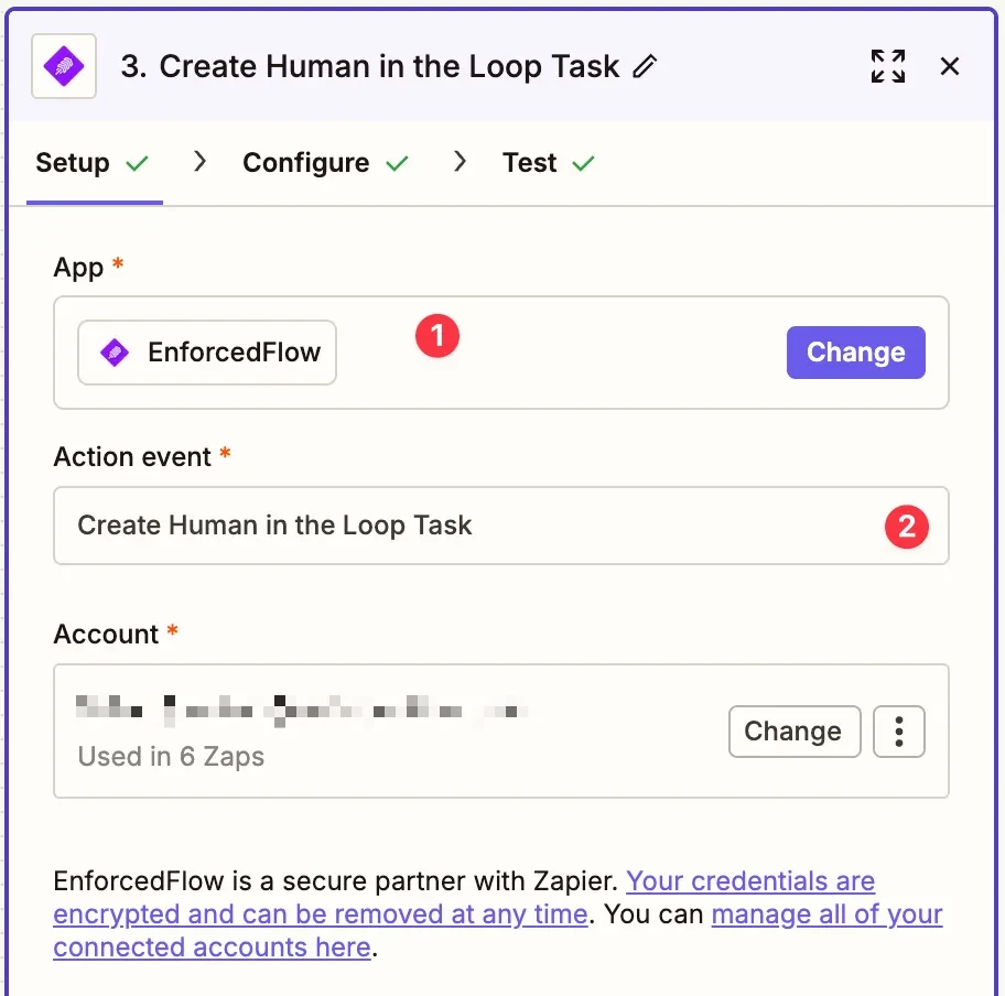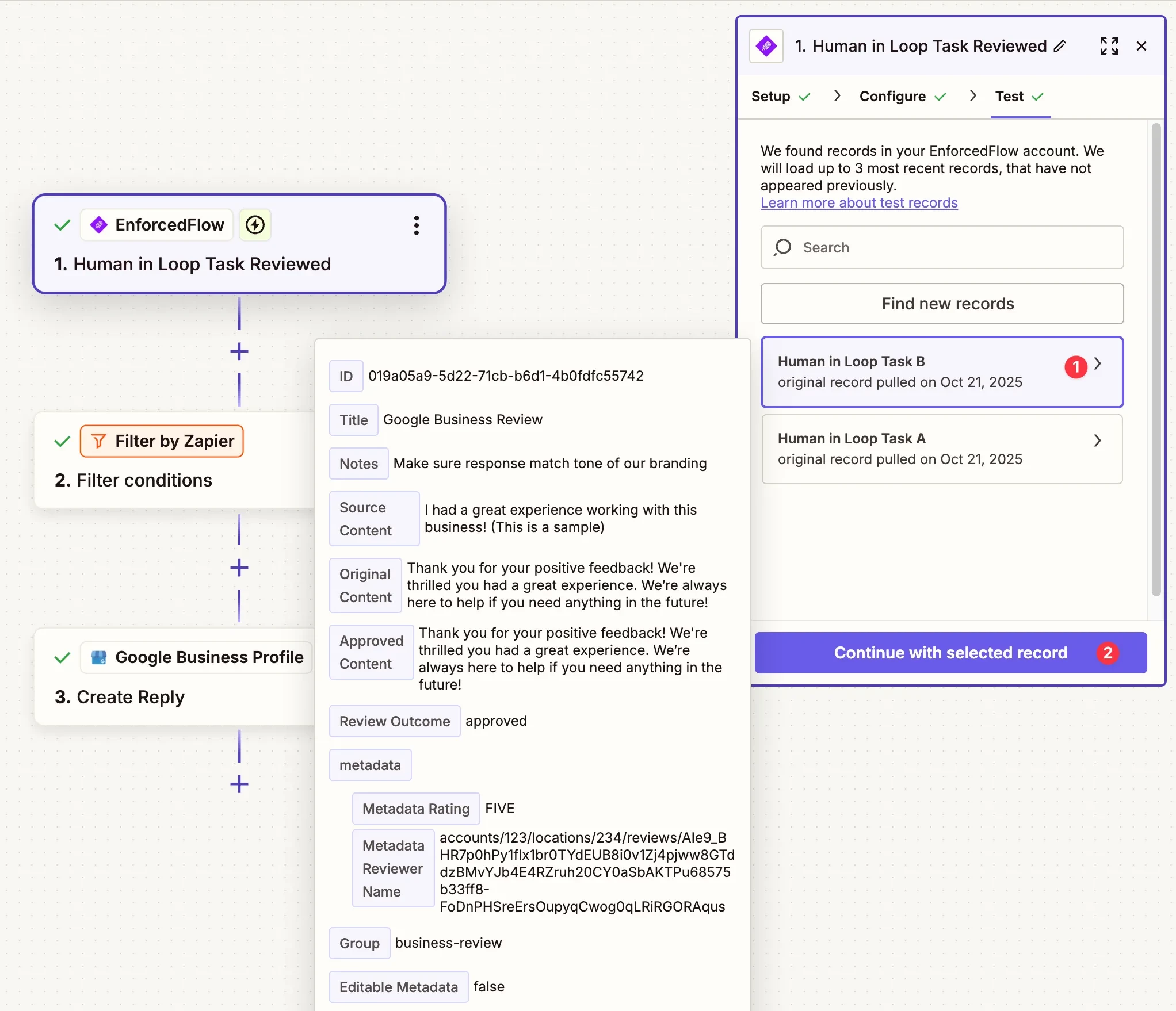 Run Test - Returns a review URL. Open it and approve the sample task (needed for Zap 2 setup).