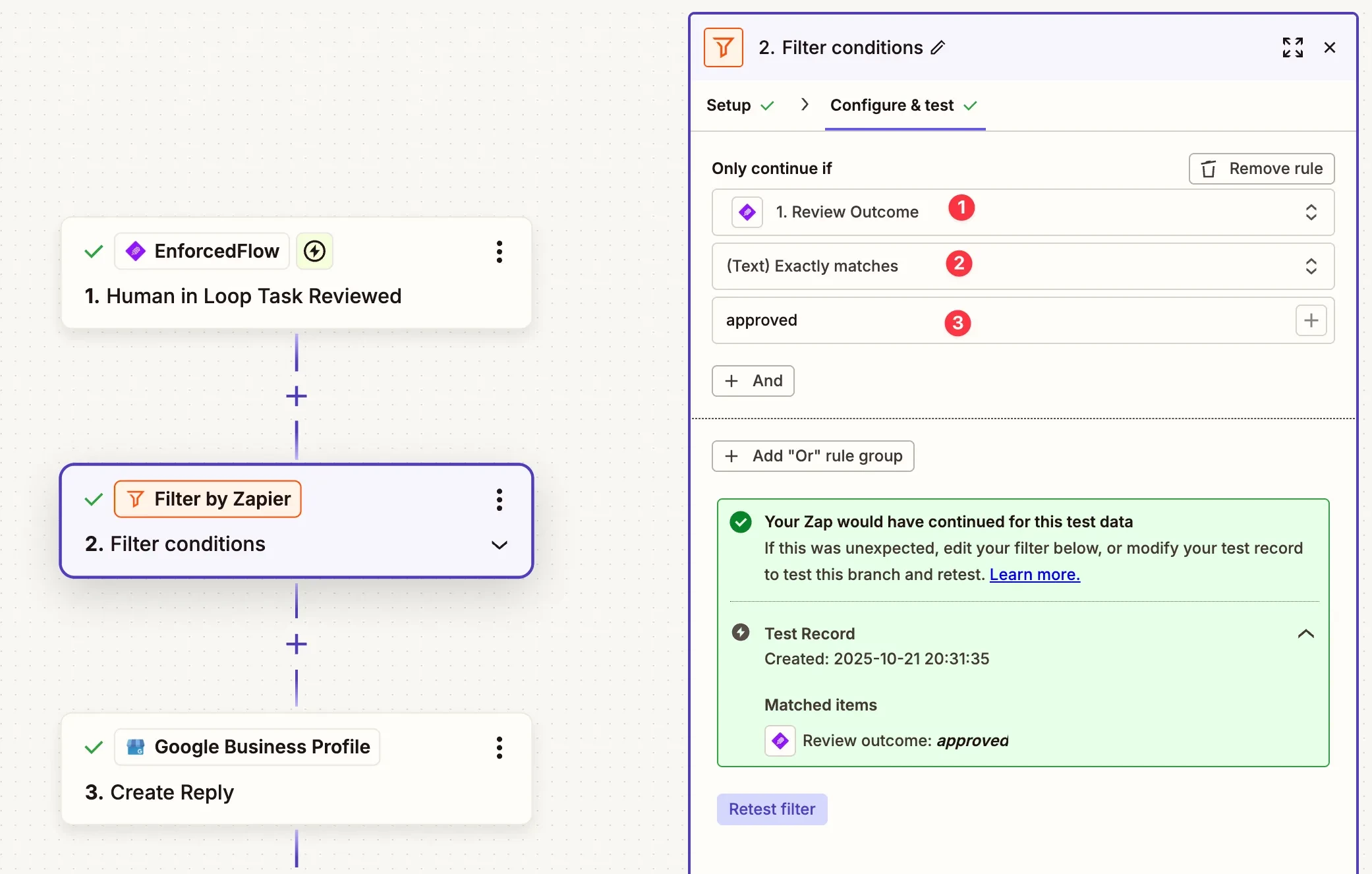 In this guide, we’ll use AI by Zapier and EnforcedFlow’s Human-in-the-Loop step to automatically generate review responses while preventing AI mistakes (misreading complaints, hallucinating policies, wrong tone) from going public.