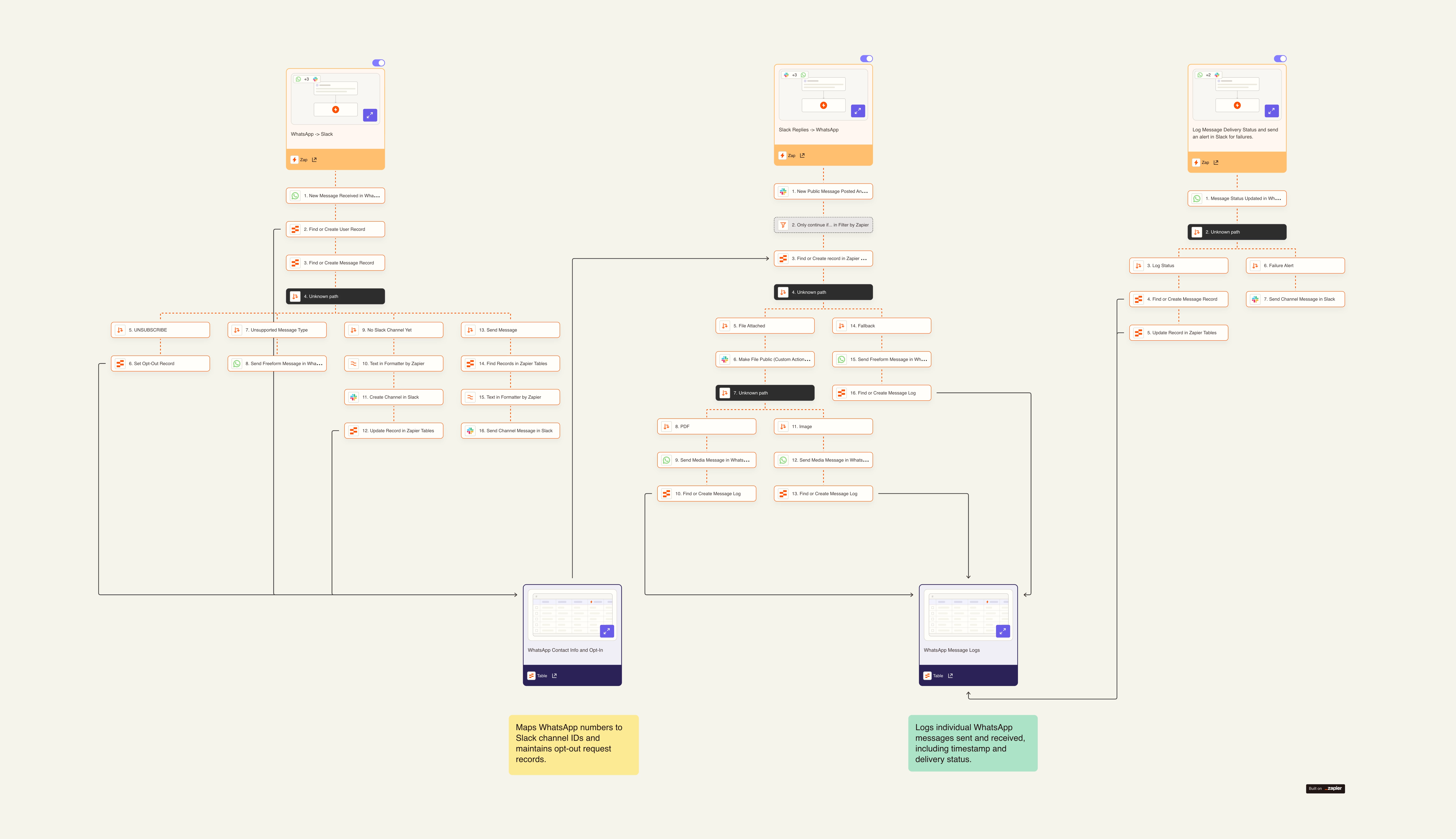 The Zapier Tables handle state management - tracking which WhatsApp number maps to which Slack channel, maintaining opt-out records, and giving me a clean audit log of message delivery status. Took about an afternoon to rebuild what used to be a much more fragile setup. Native integrations win.