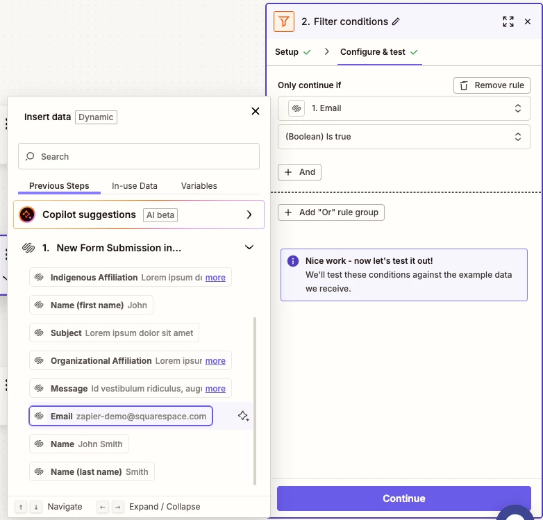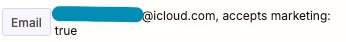 On the live zap run, I used my personal email as a test form submission in SquareSpace but I set up an initial Trigger Action, to Filter by Zapier for the email field boolean to be true. In my test submission, I of course checked the sign up for news and updates box, and this is what returned as an email value! (above) please notice that additional string (text) has been appending to the field value and reads ‘, accepts marketing:true’.