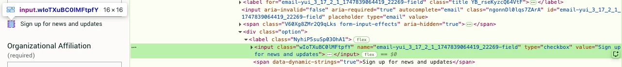 I can see the email field, but there is no indicator of that checkbox field. I see that in there is this information regarding the field on Chrome Inspector: