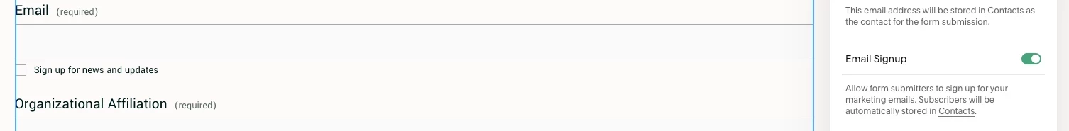 form fields exist, but the checkbox for the email signup consent functionality on SquareSpace does not pull as it’s own field (above) you’ll see in the SquareSpace page editor on this form, you have an option for the email signup checkbox.