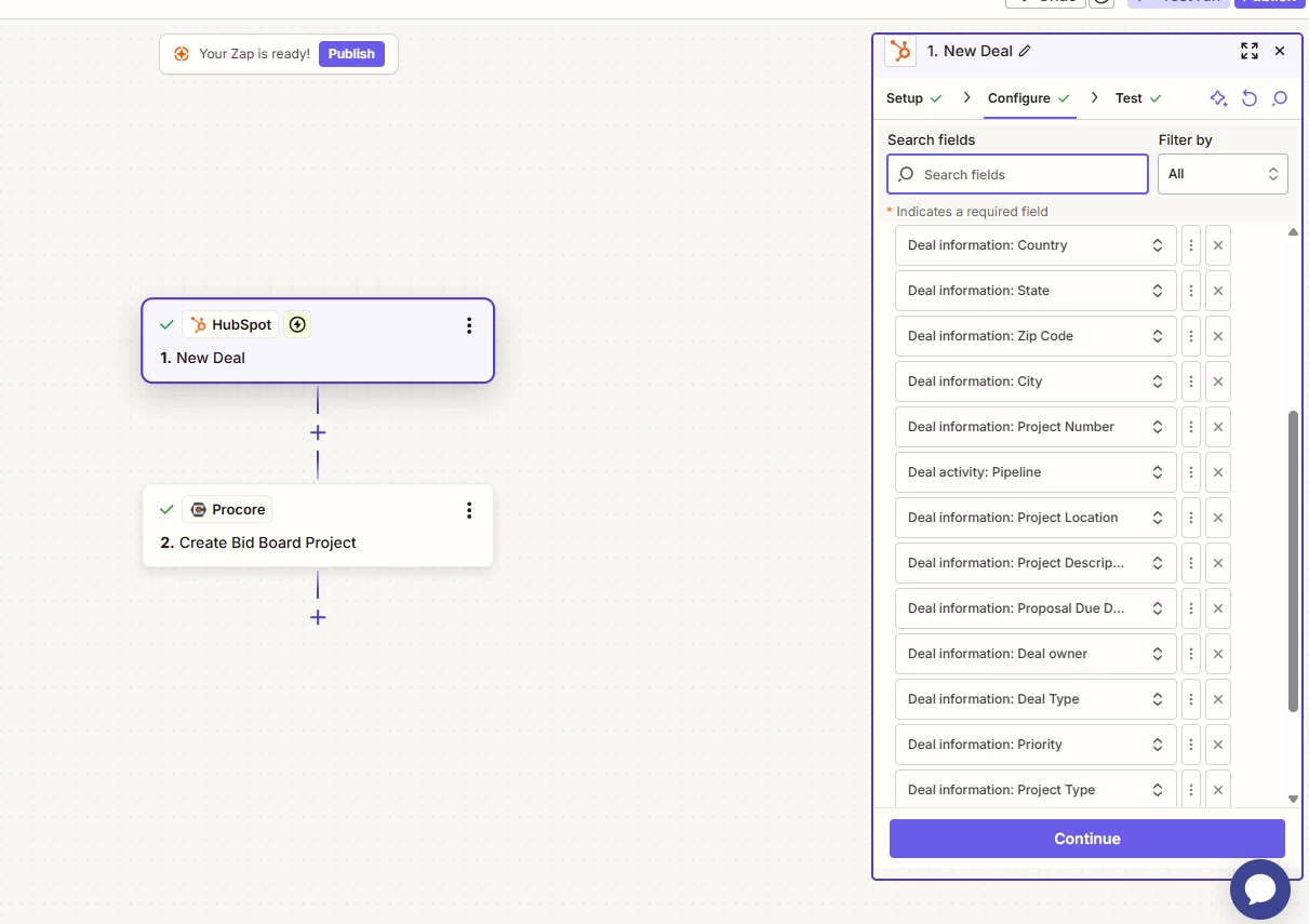 when setting up my zap to send hubspot deal to procore bid board i noticed the customer company is not an option and would like to add that to be pulled into procore.. also the Office field is the same.