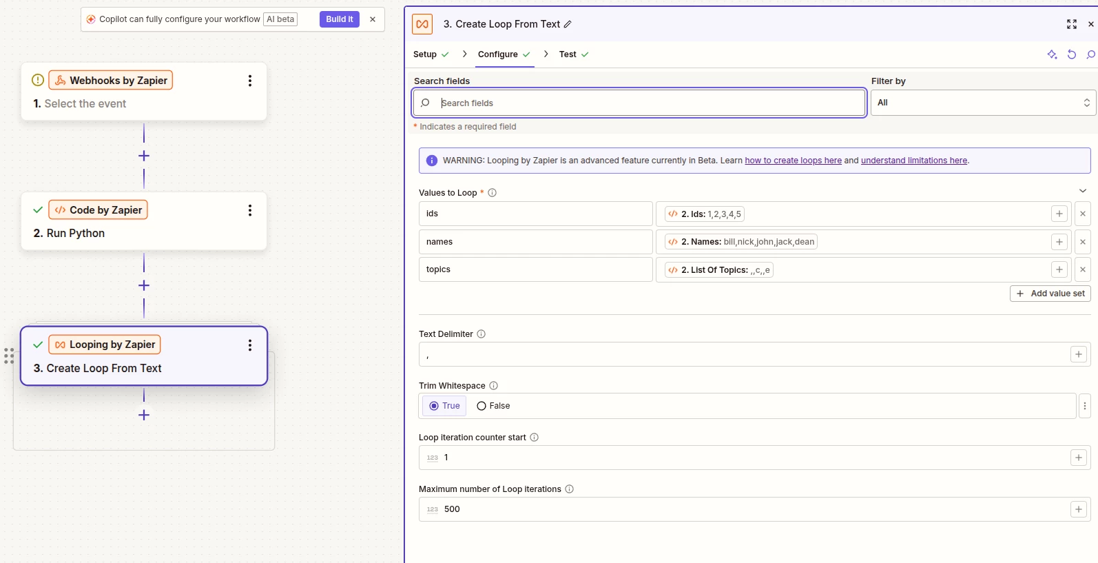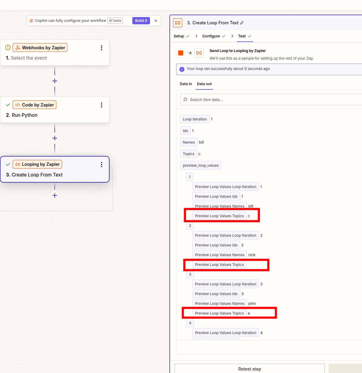 Sorry to hear that the Zap sent out the wrong information! From what you’ve described it seems like this might have been caused by the number of Values to Loop values not being the same for each set (id, names, topics). If the values that were blank still had a comma to separate them then they should still be recognized and not skipped.