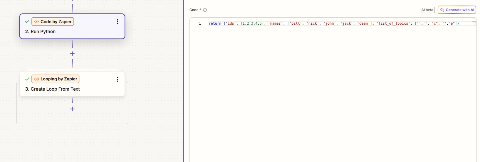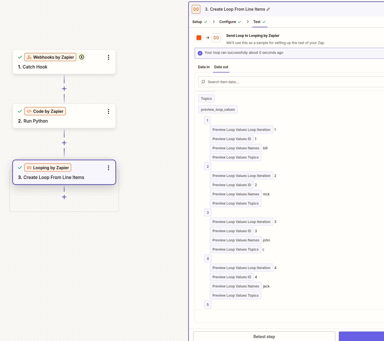 If you are using arrays (as shown in the Python Code), then use this Zap action: Looping - Create Loop from Line Items