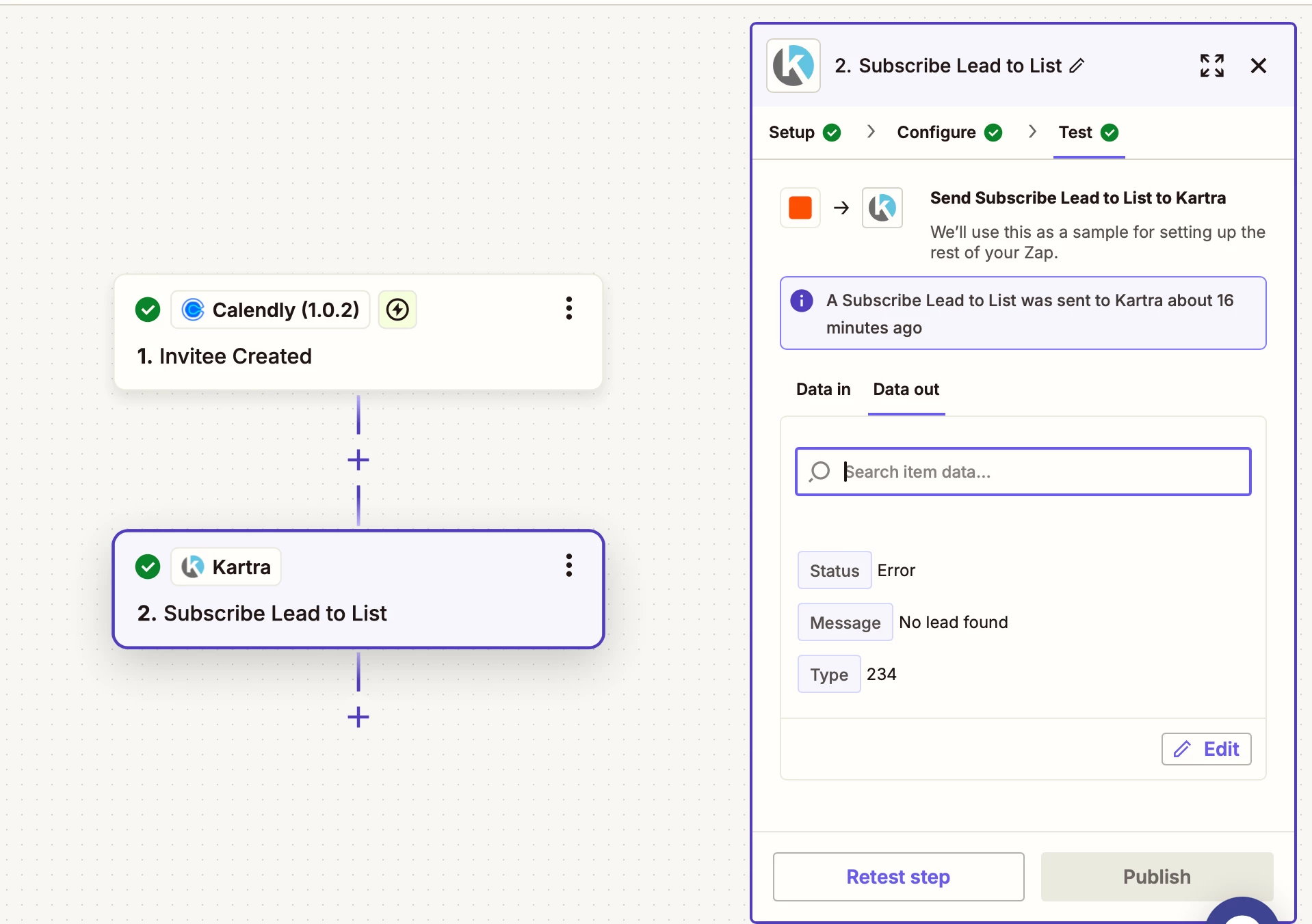 Hi, I have a zap set up to add leads in Kartra when they schedule an event in my Calendly. Zapier is reporting that the Zap is running fine, and I can see the run history of the zap. Problem is, these contacts are not being added to my Kartra list which I have just figured out!