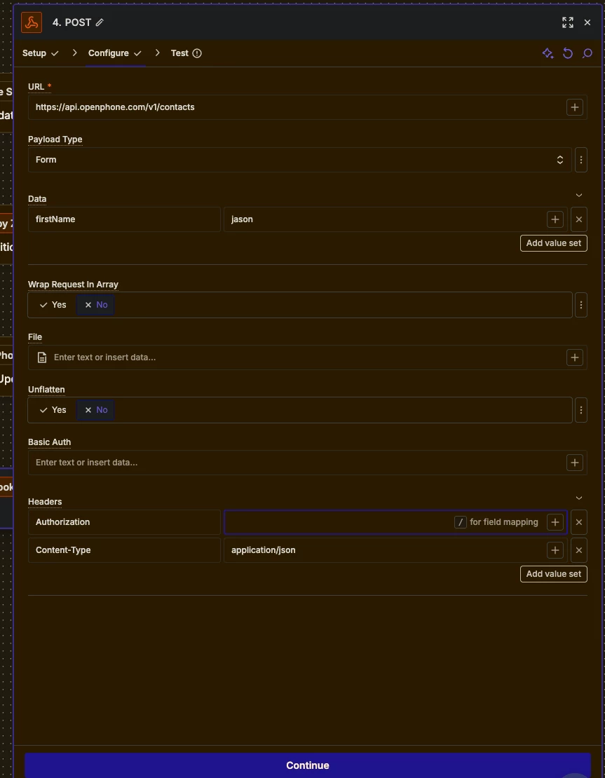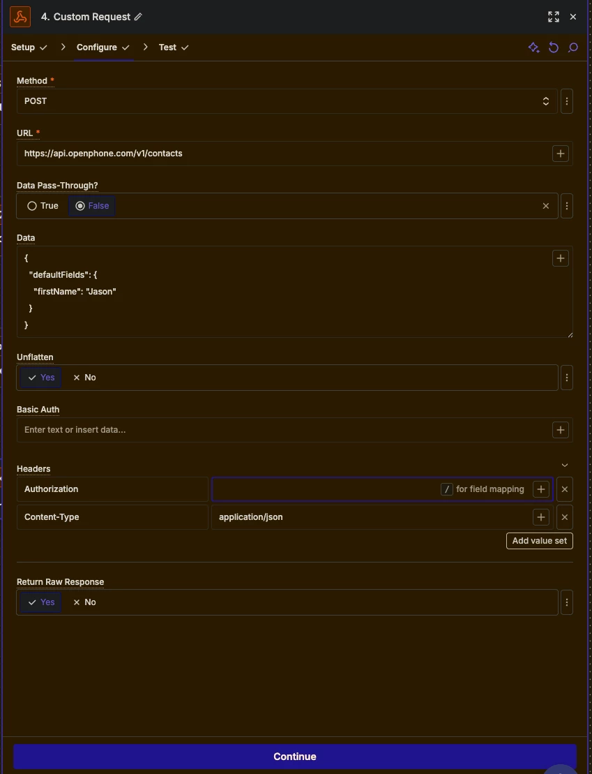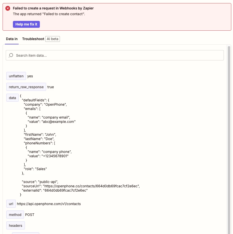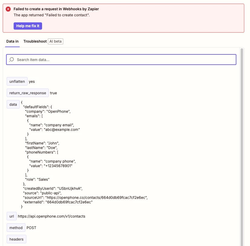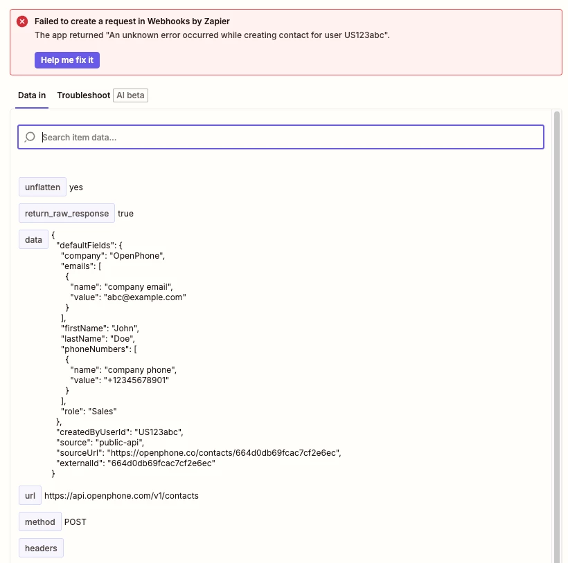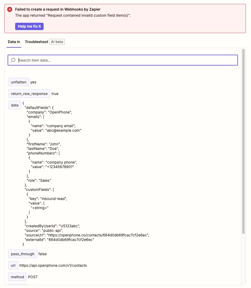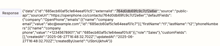 Then I tried a custom request and got a good output, the only problem is that the contact is not showing in OpenPhone.