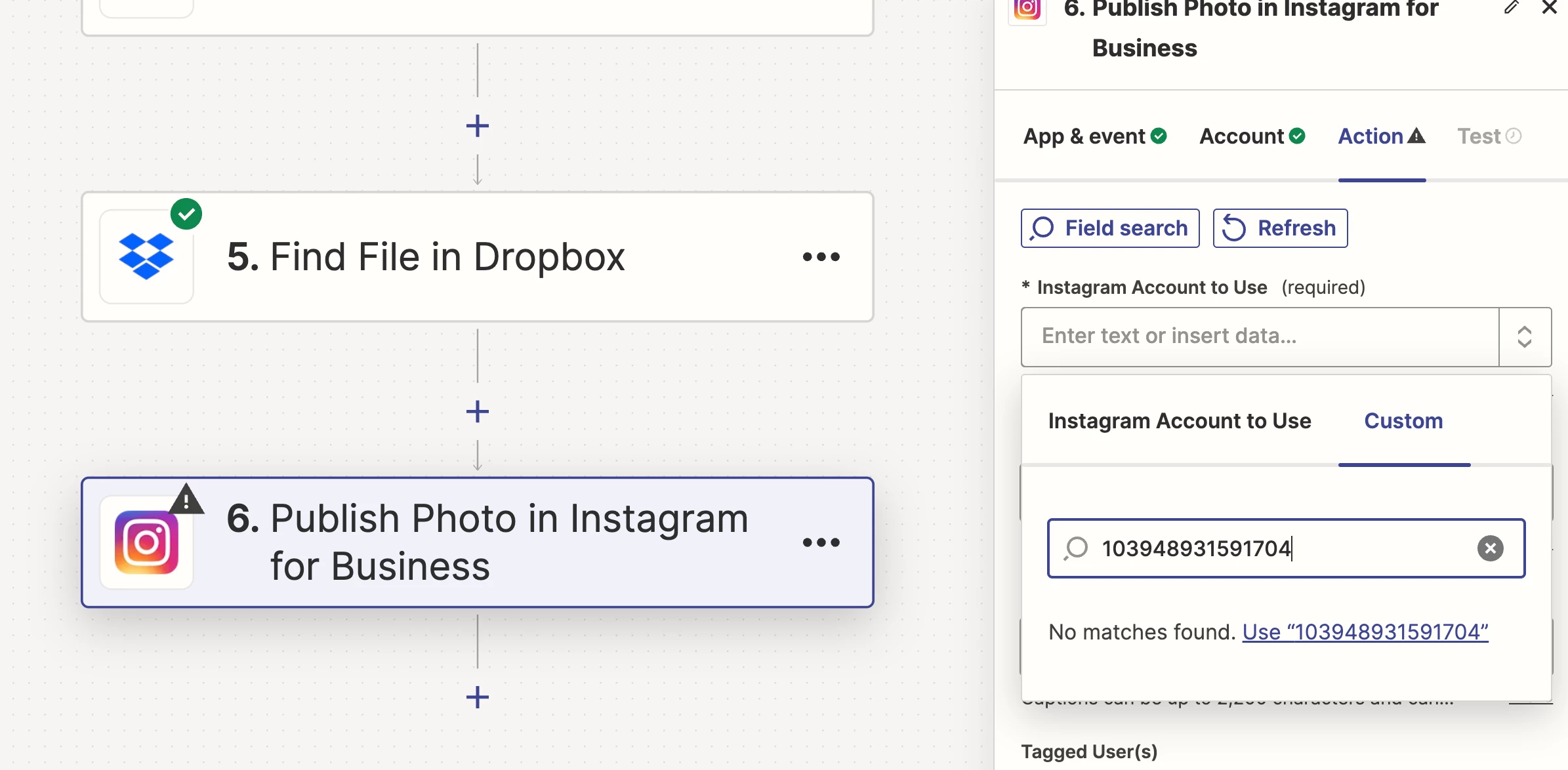 After connecting to my facebook account, when selecting the “Instragram account to use” I get the following error message: