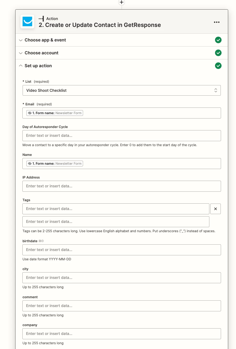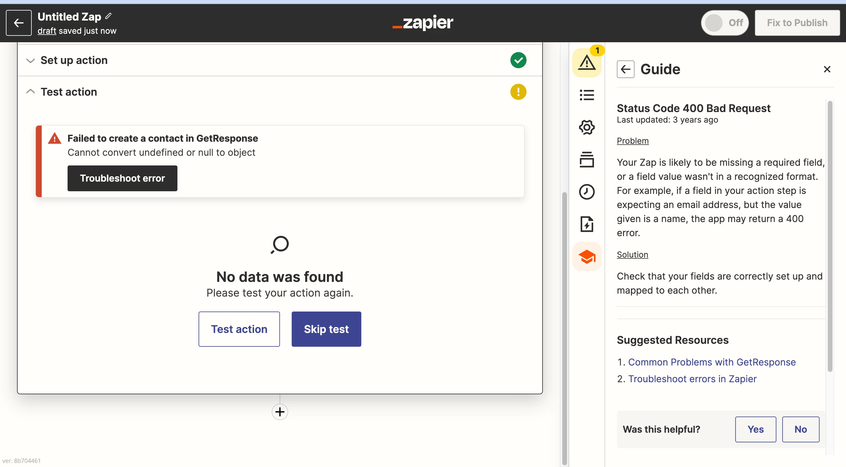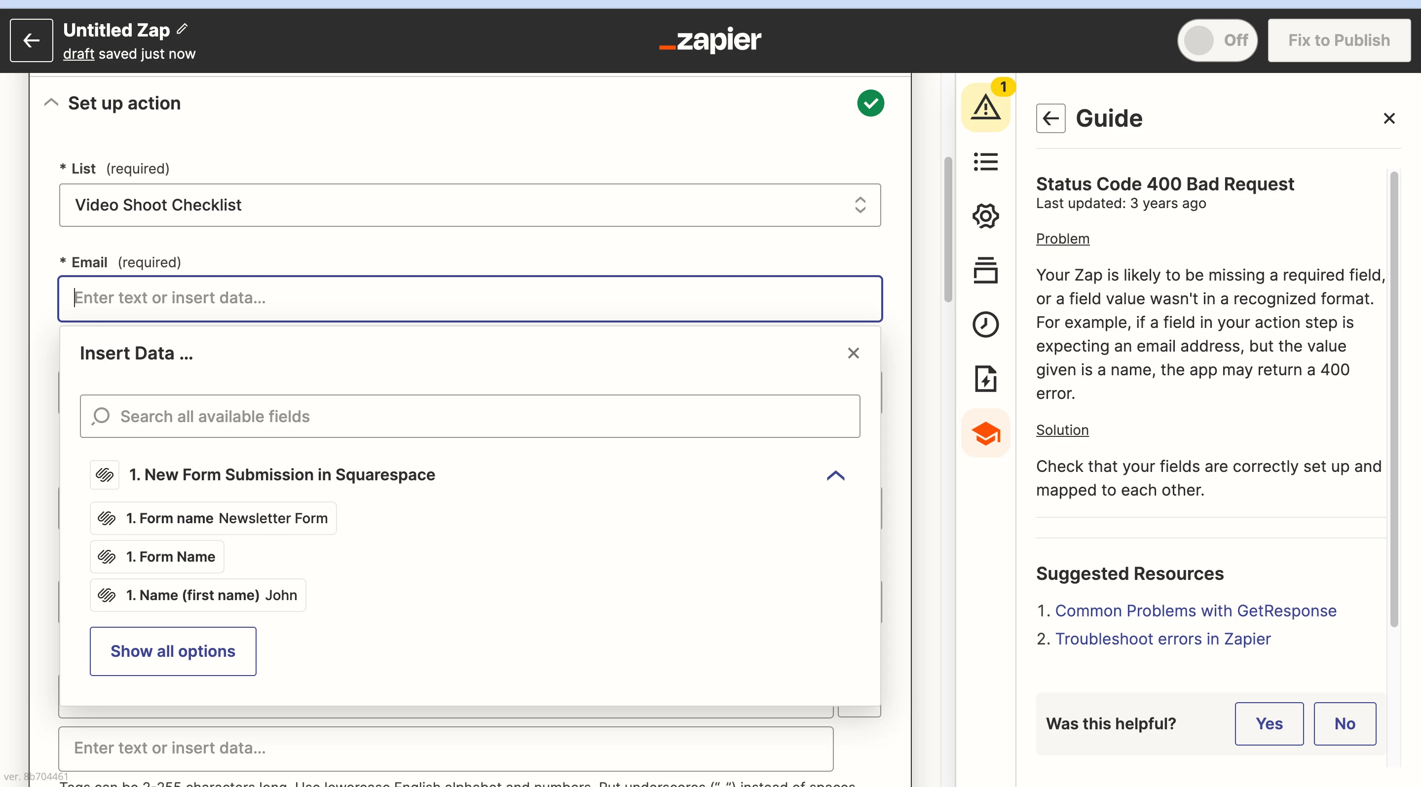 Cannot get zap to pass test connecting newsletter form from squarespace to getresponse